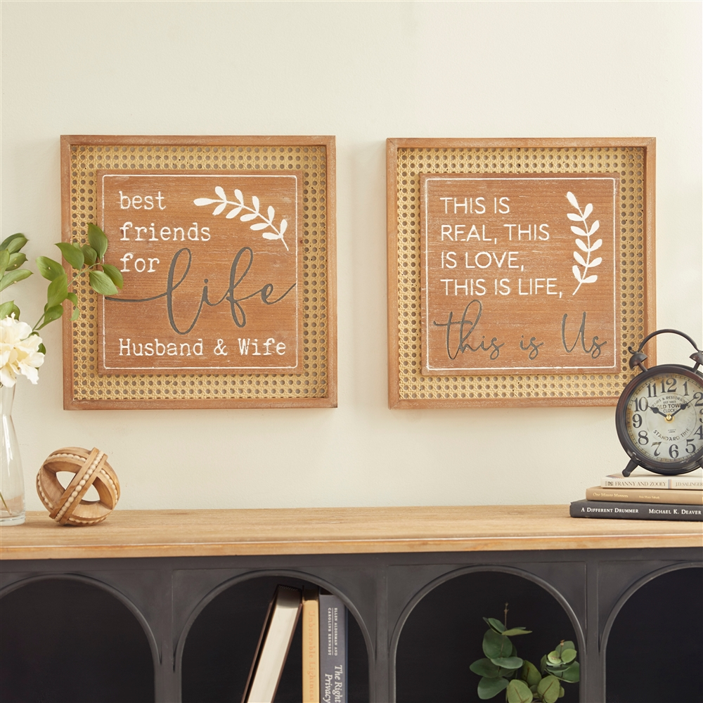 - Each wall decor features a natural brown wood frame