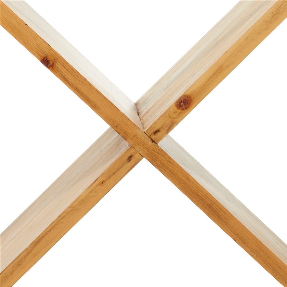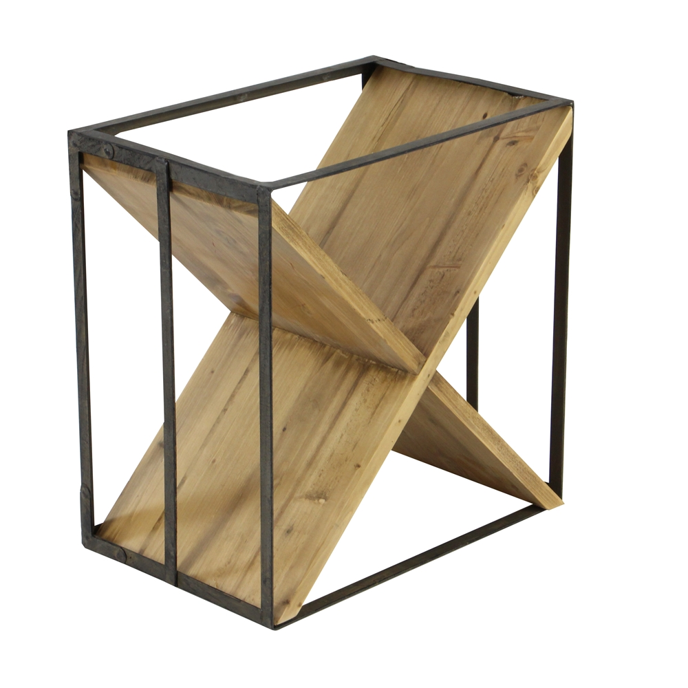 - Two rectangular wood pieces clasp each other at the middle sections to form an “X” that cradles 9 wine bottles