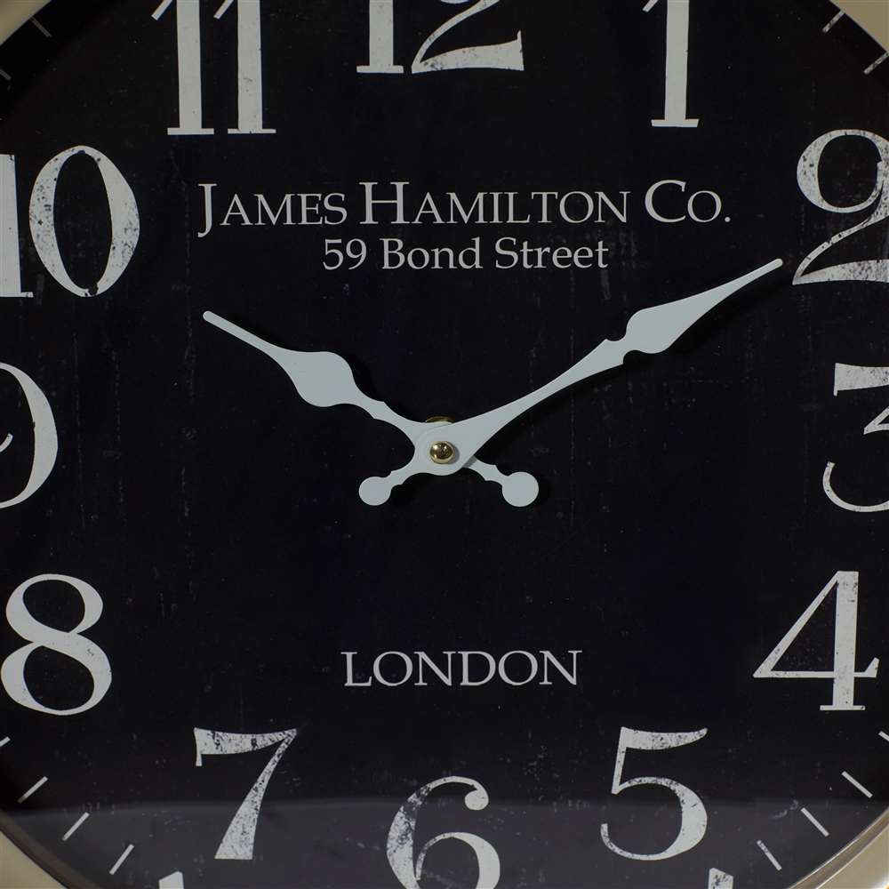 - Features a black clock face with white numerals and clock hands