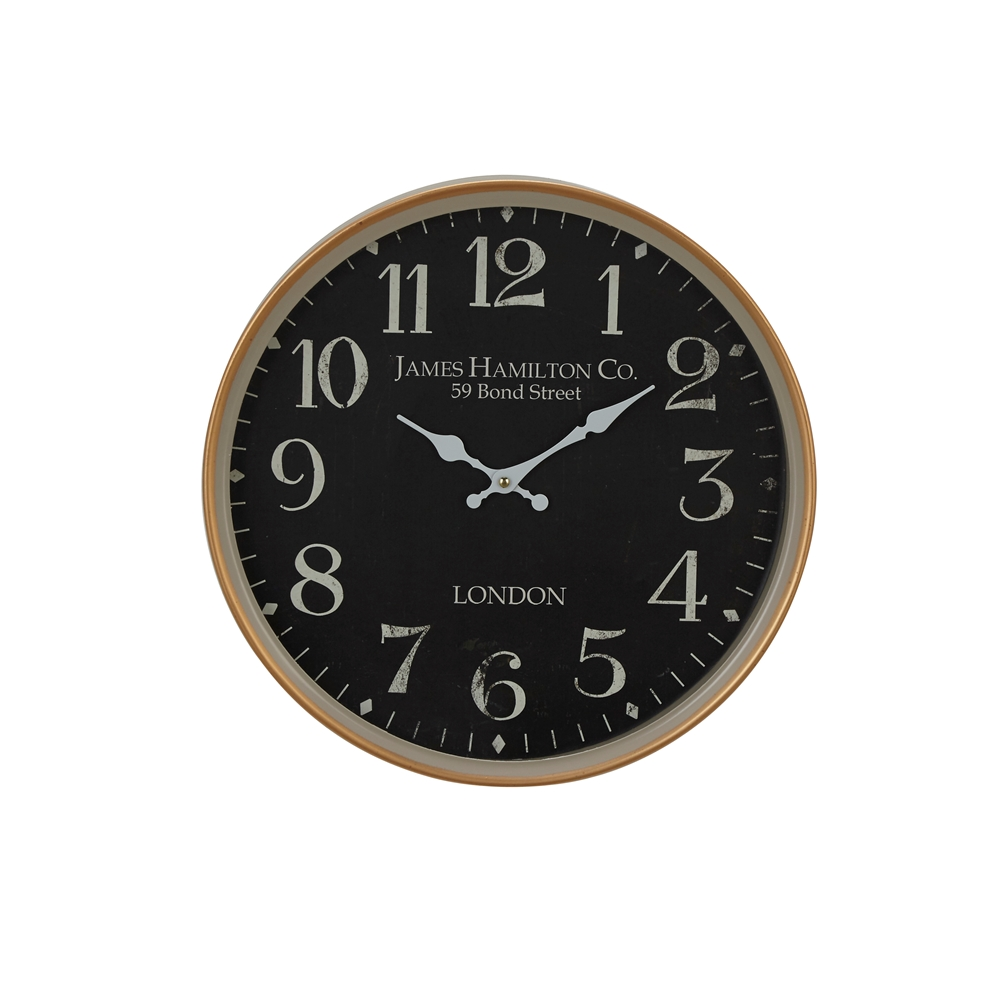 - Round metal wall clock with light gray frame and brass lining, and a black clock face with white numerals and clock hands
