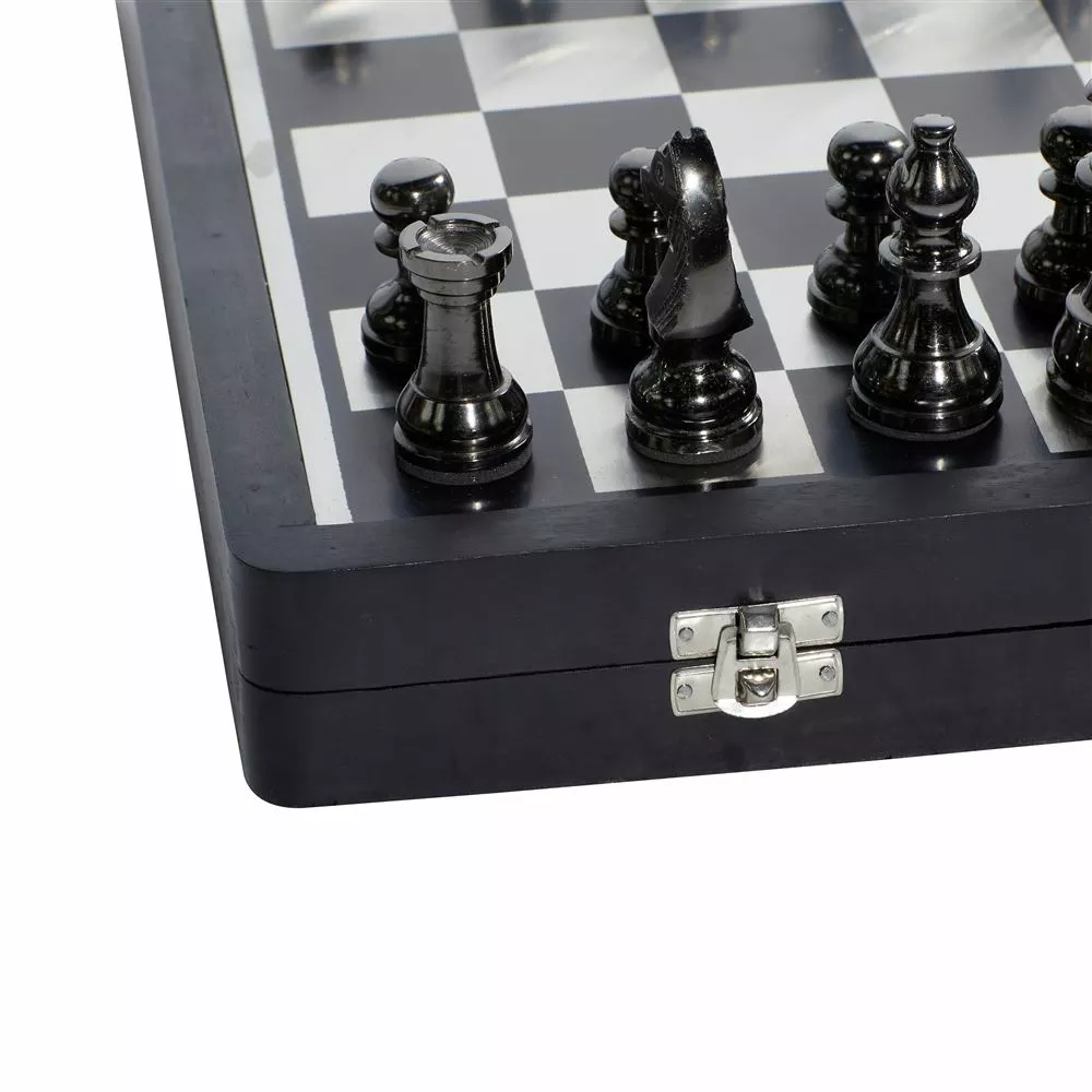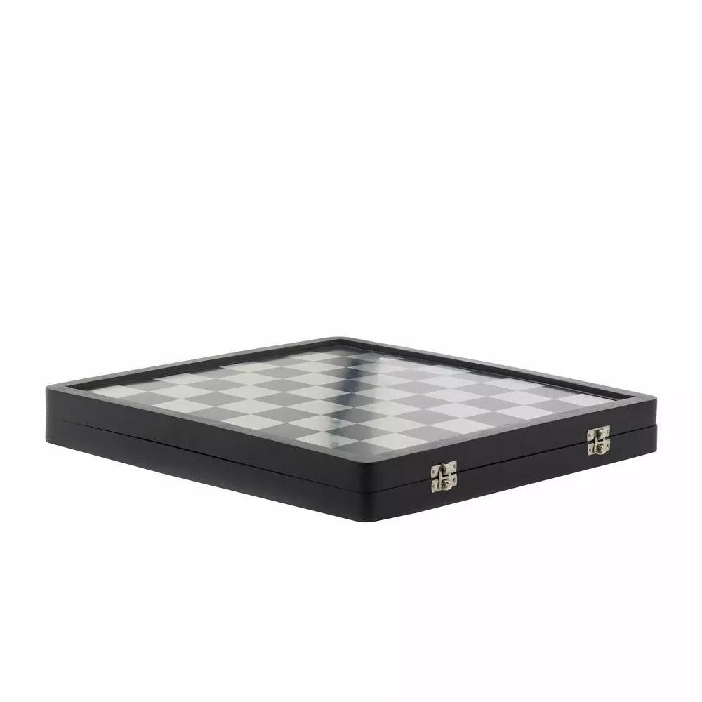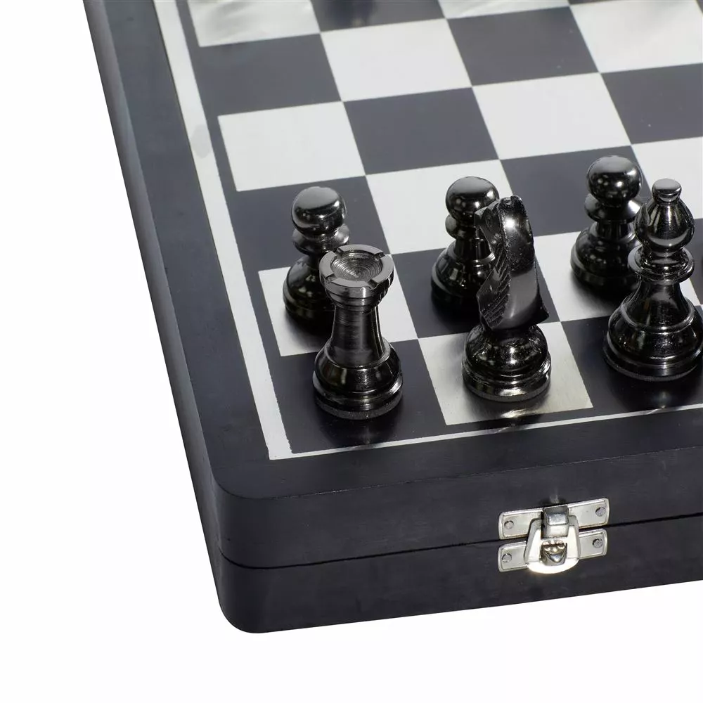 - This traditional style inspired design black aluminum and wood chess game set features a briefcase style board with metal latches for storage of the chess pieces