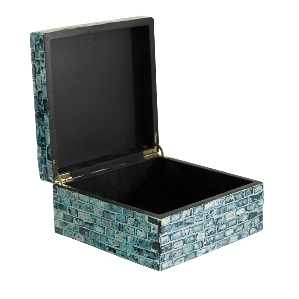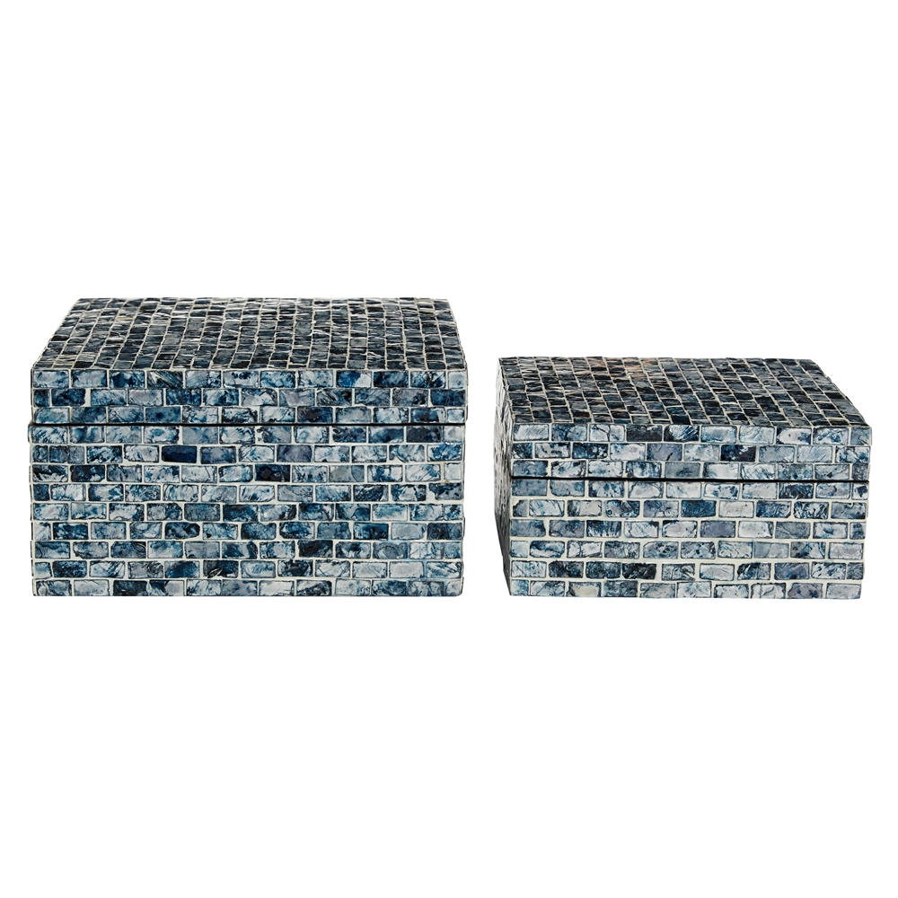 - These jewelry boxes feature an inlay of oyster shells in blue and iridescent white