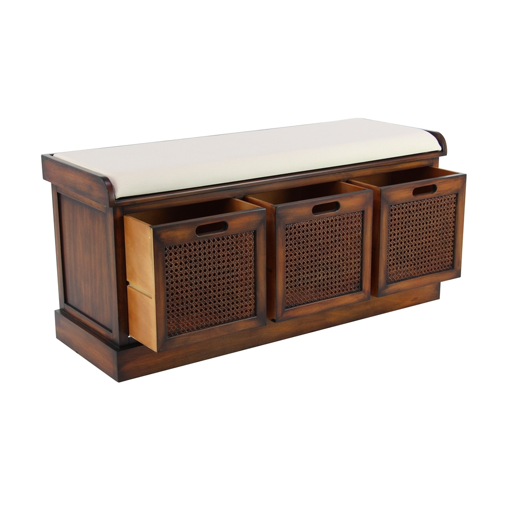 - Features a rectangular frame with cushioned seat, 3 drawers with woven design, and flat base