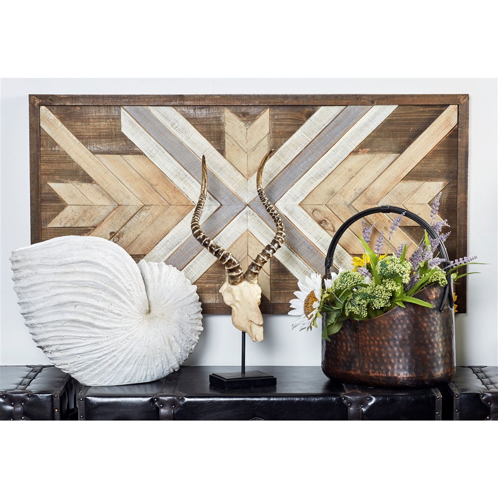 - Southwest style crisscross chevron pattern in muted white, grey, and brown hues