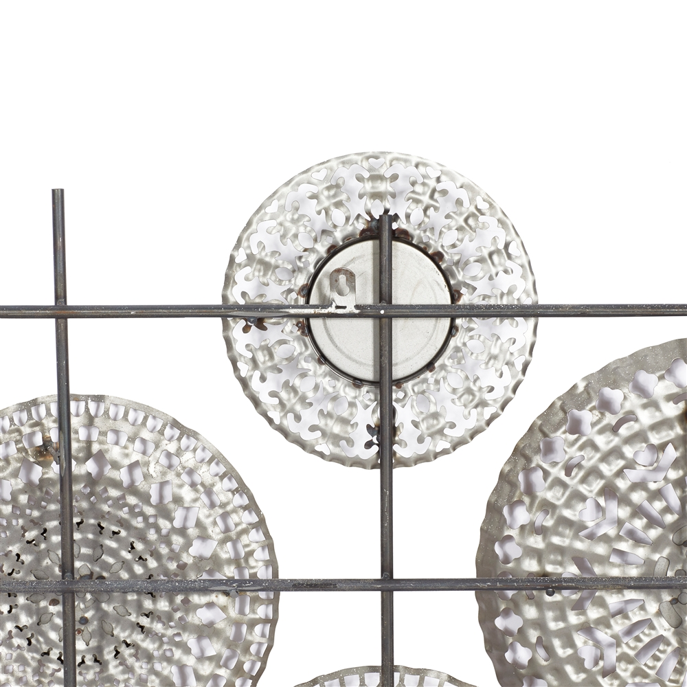 - This wall decor features circular metal frames holding mirrors in an intricate system of lines and round shape patterns