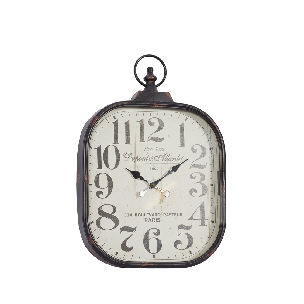 - This square wall clock features a vintage-inspired design that is best situated on top of a rustic brown wood dresser and against a bare wood-finished wall