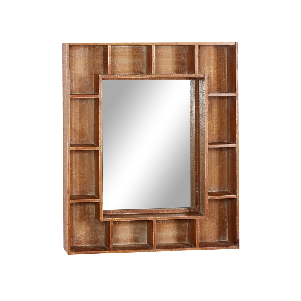 - This versatile wall mirror showcases a distressed brown wooden finish