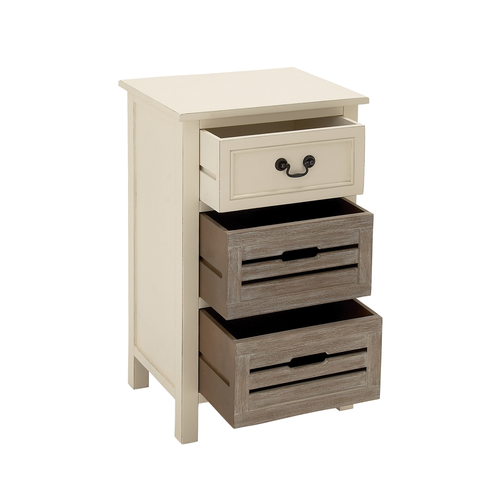 - Features 1 slide-out drawer with a metal pull handle and 2 shelves with wooden crates
