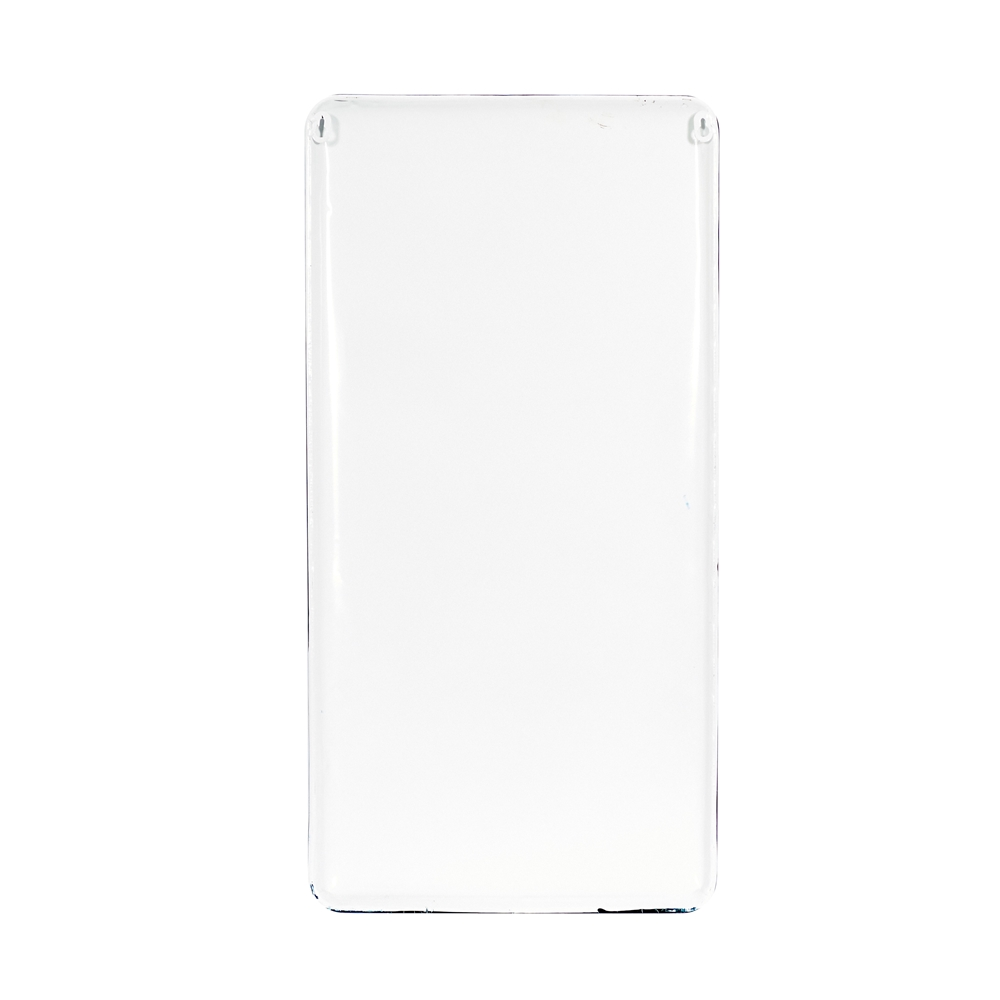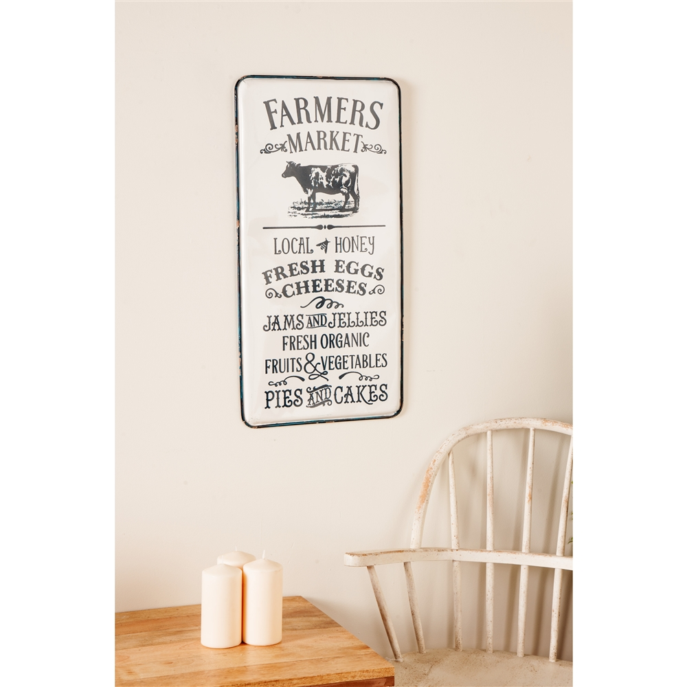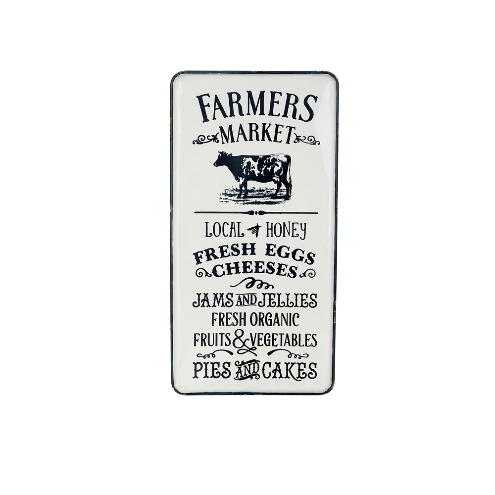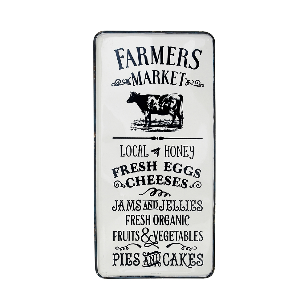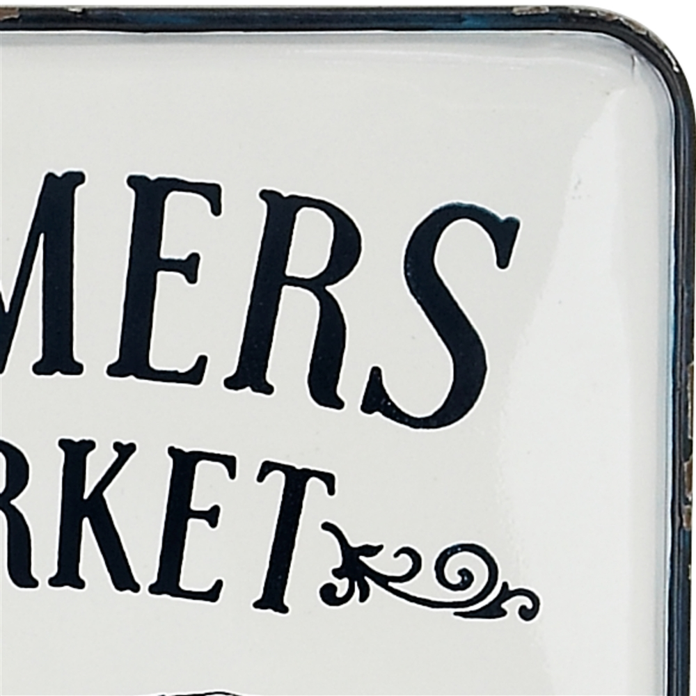 - Farmer’s market inspired text and illustrations are printed in black on a rectangular panel in a glazed white finish