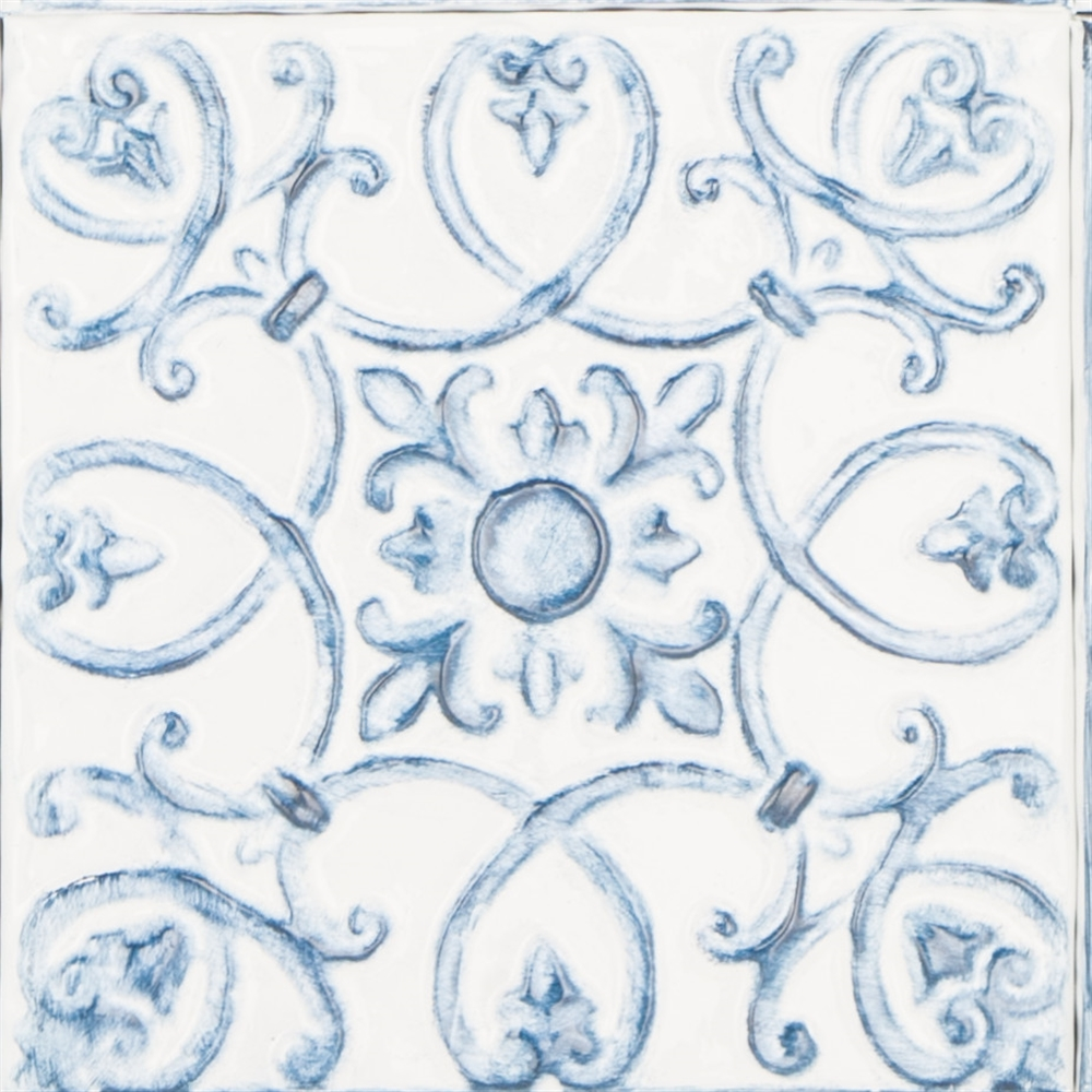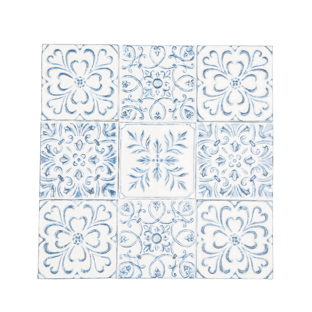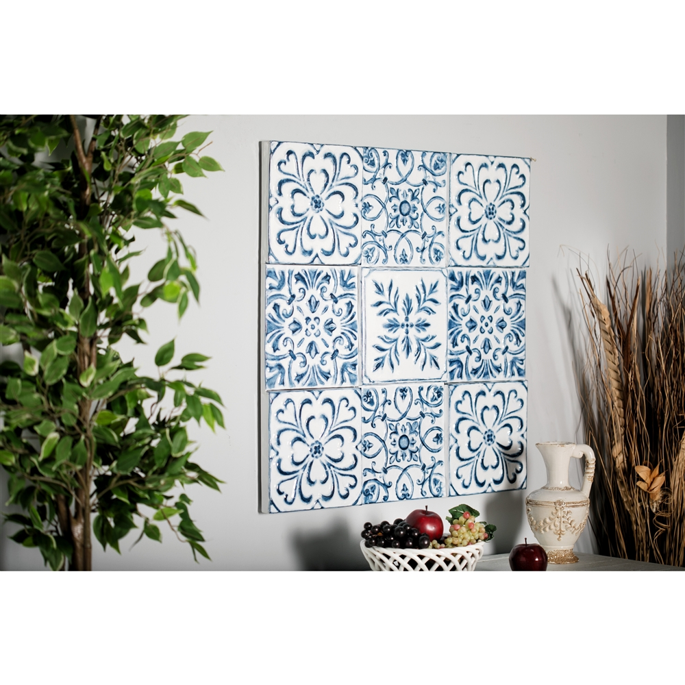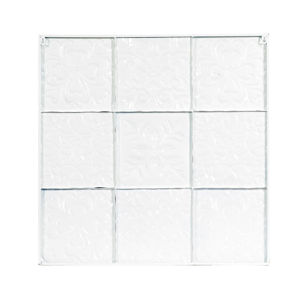 - Features a large-sized sculpture of 9 square tile panels filled with assorted flourish and scrollwork designs