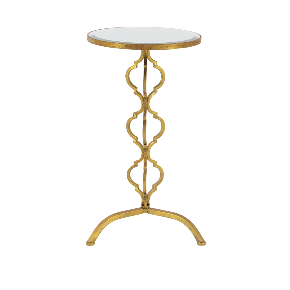 - It features an open gold-finished scroll stand