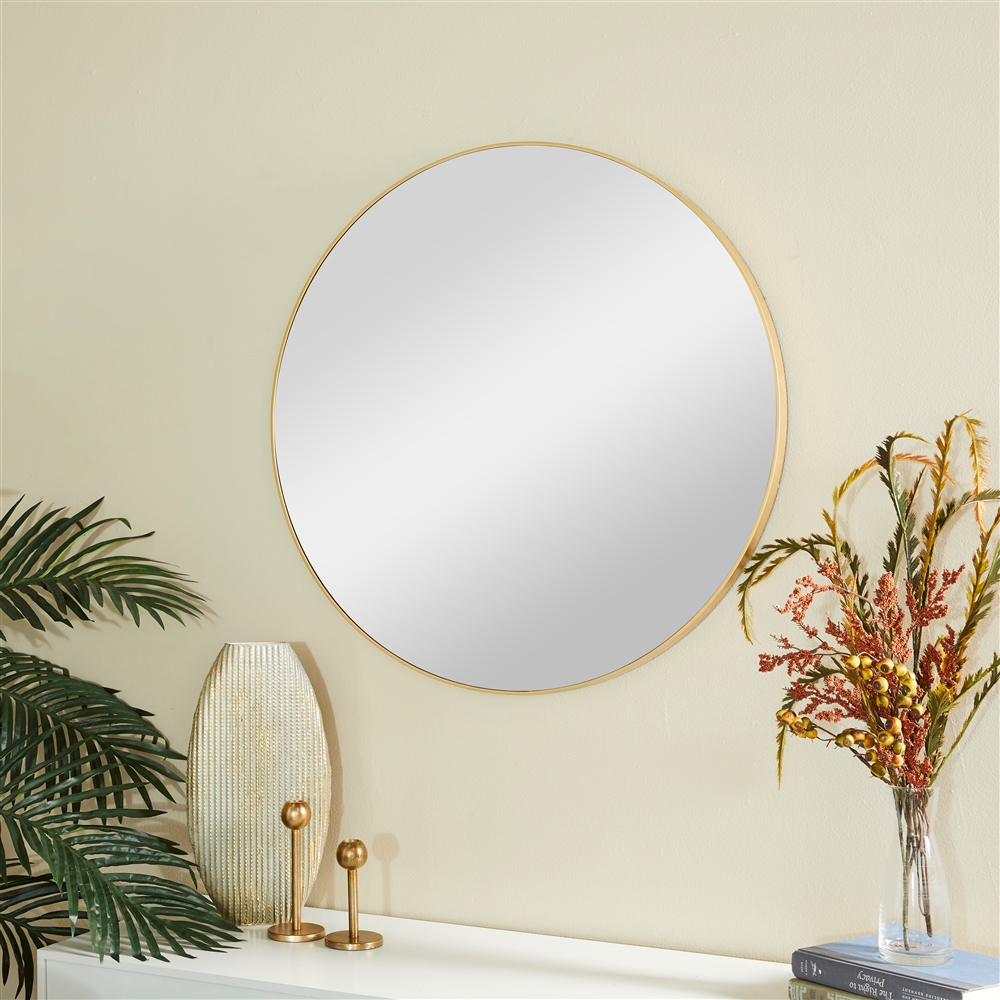 - This decorative wall mirror decor highlights a matte gold frame finish for a subtle but elegant look