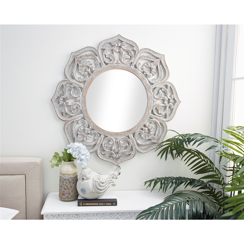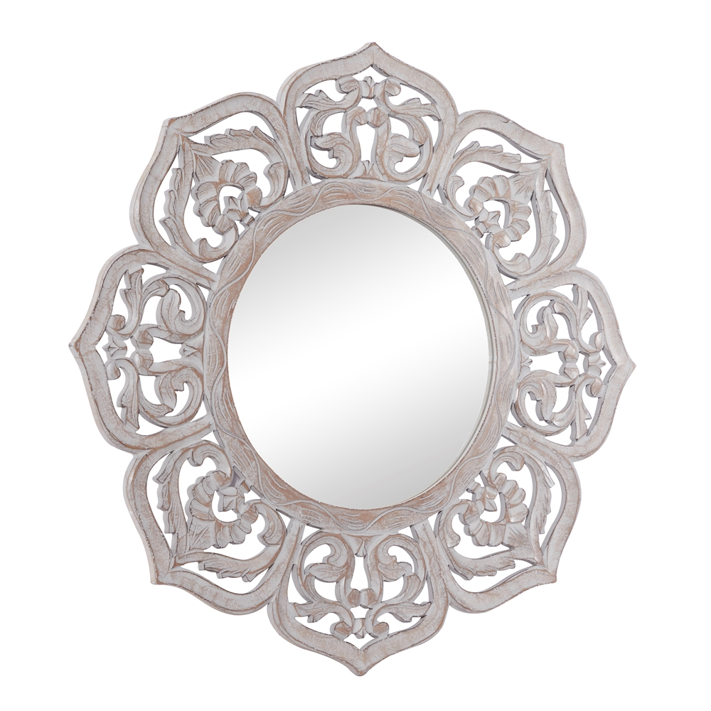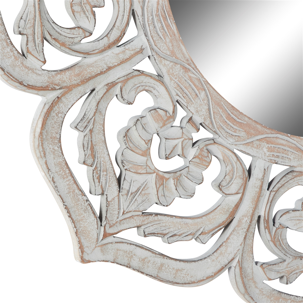 - Features an 8-petal flower design made of carved wood and showcases intricate scrollwork patterns