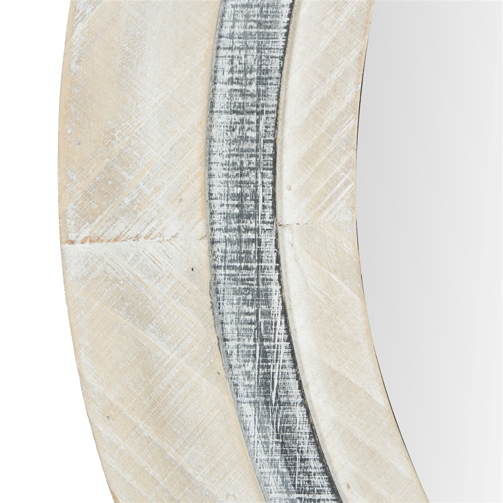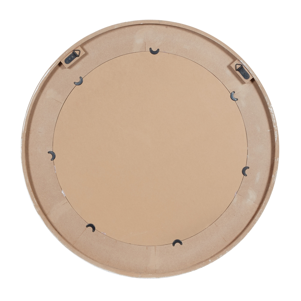 - It features a thick round wooden frame and comes with a dark grey inner framing