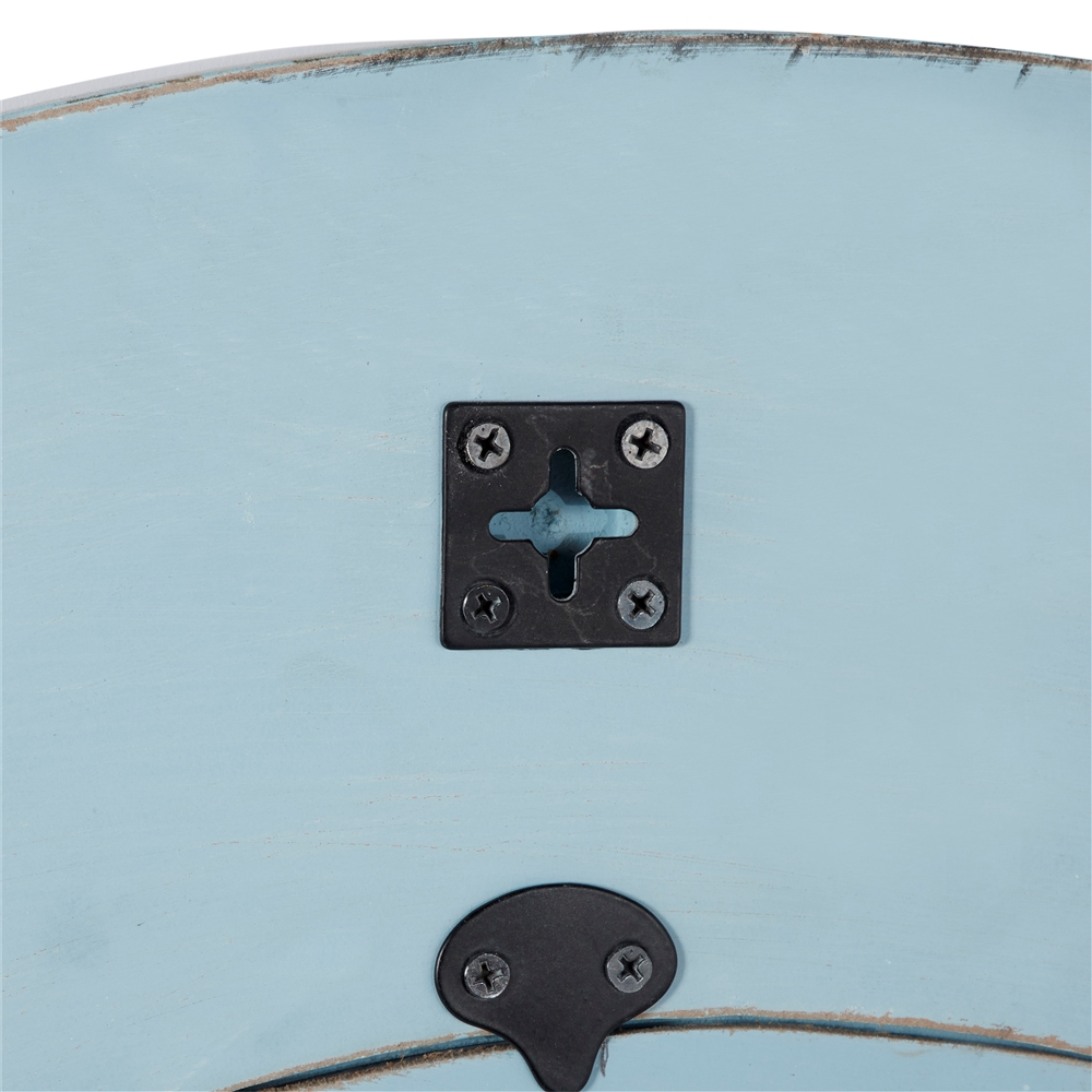 - Distressed white and powder blue paints on wood create an antique feel and bring texture to a rather plain background