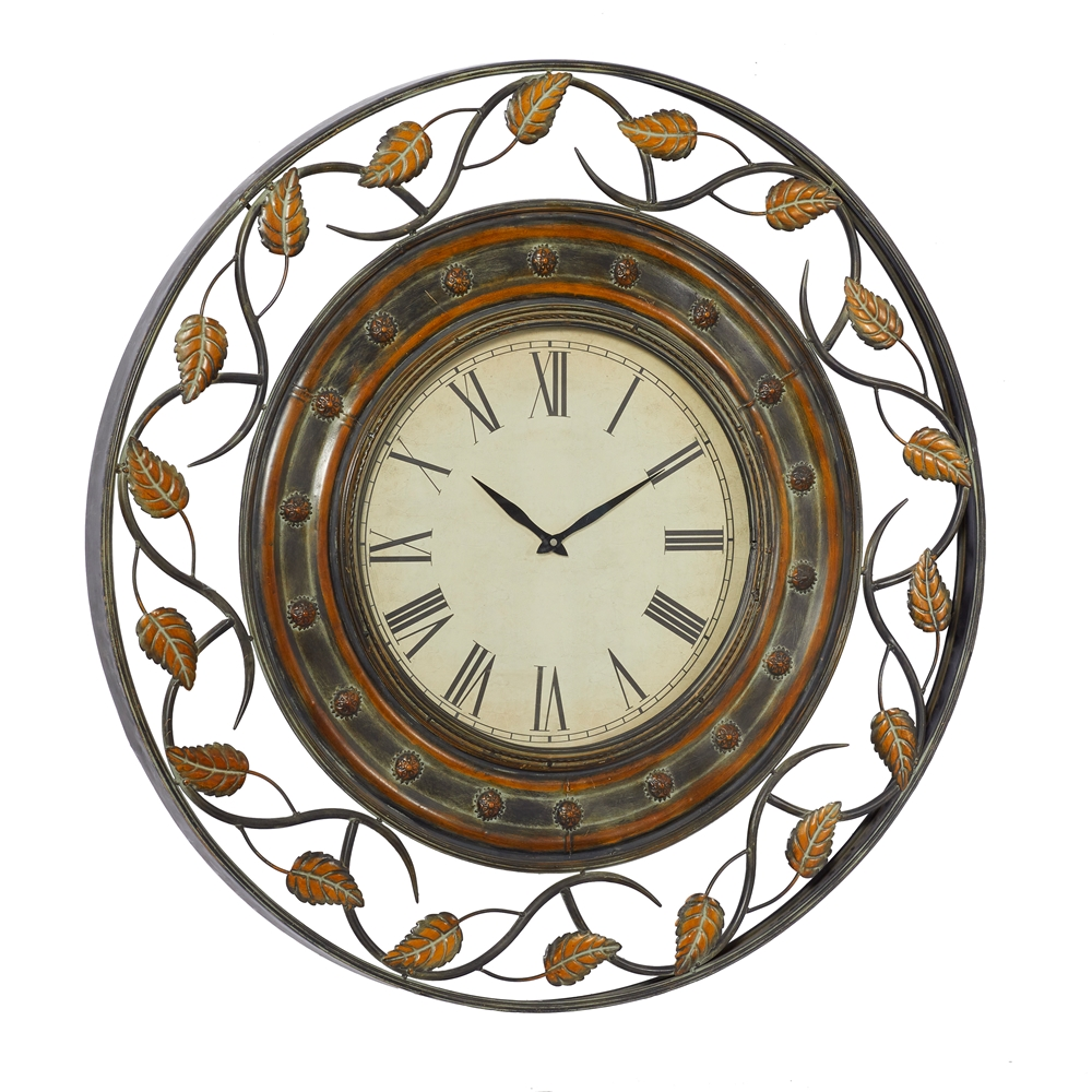 - Natural and rustic style with textured brown metal frame with decorative vines and leaf sculptures, white clock face with large black Roman numerals
