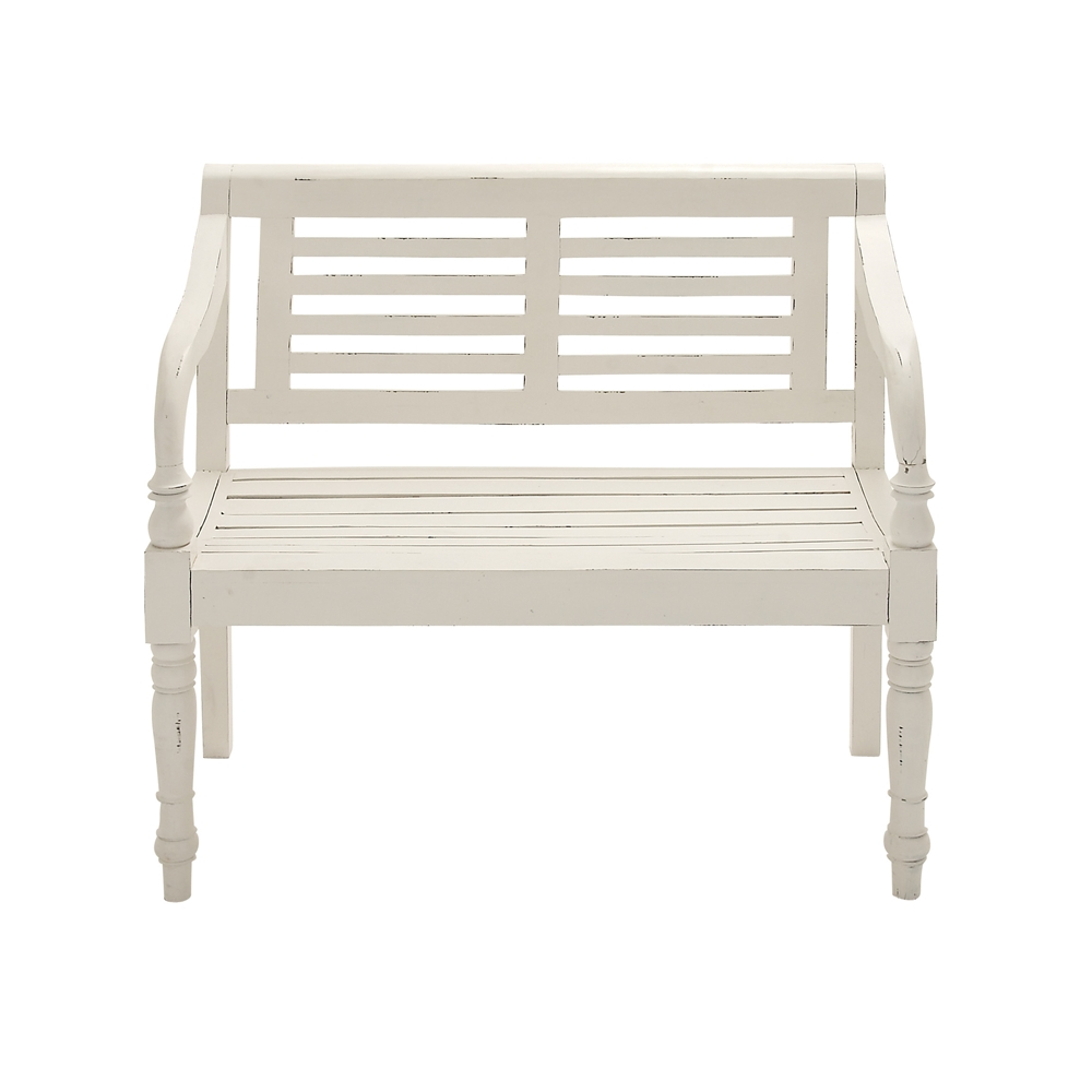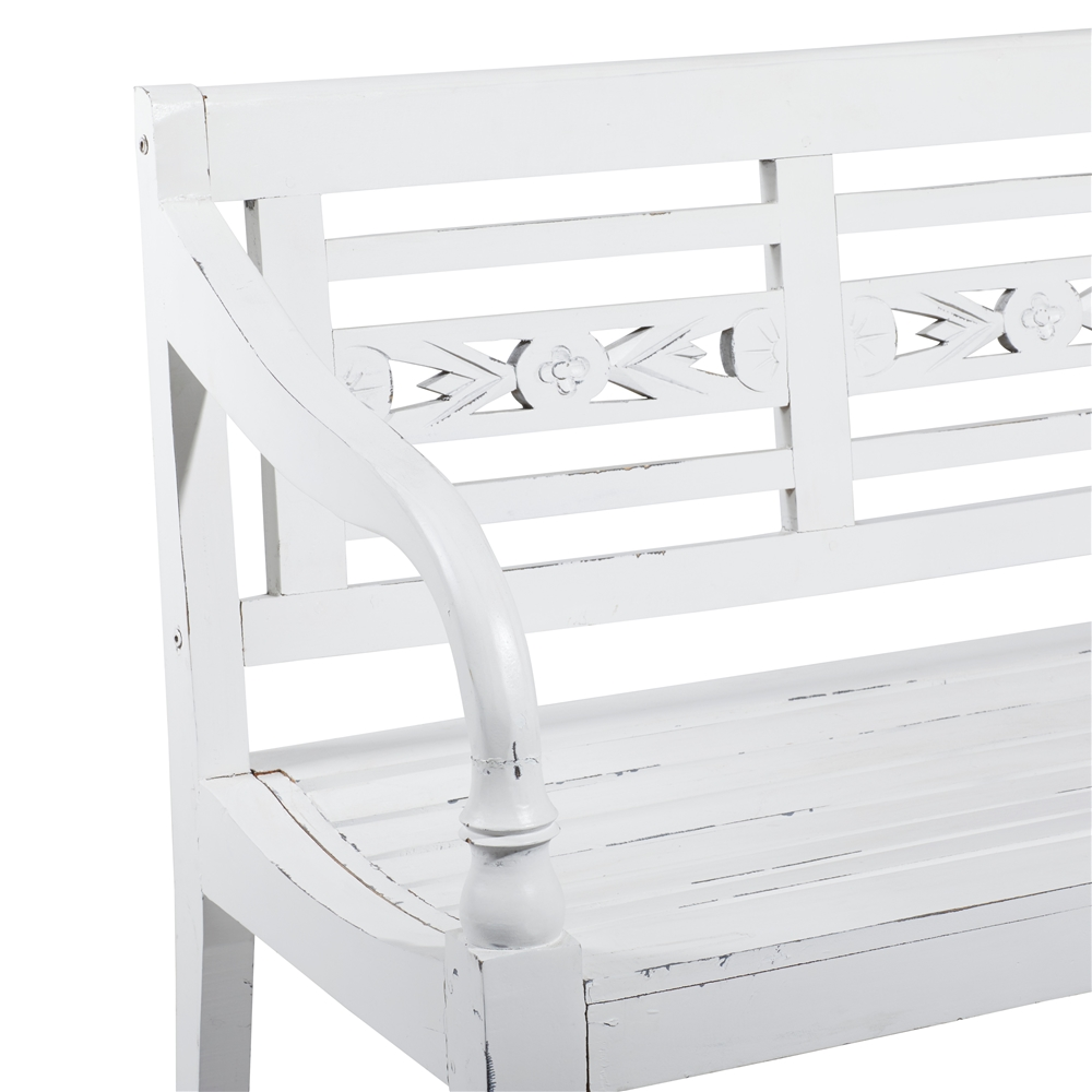 - This farmhouse wood bench highlights an alabaster-white overall finish