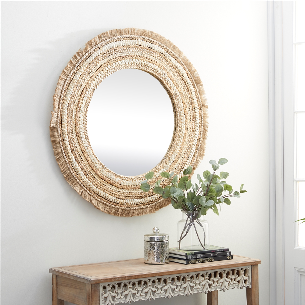 - Features an extra large-sized round structure and a naturally weaved burlap fibre and fabric wall mirror design