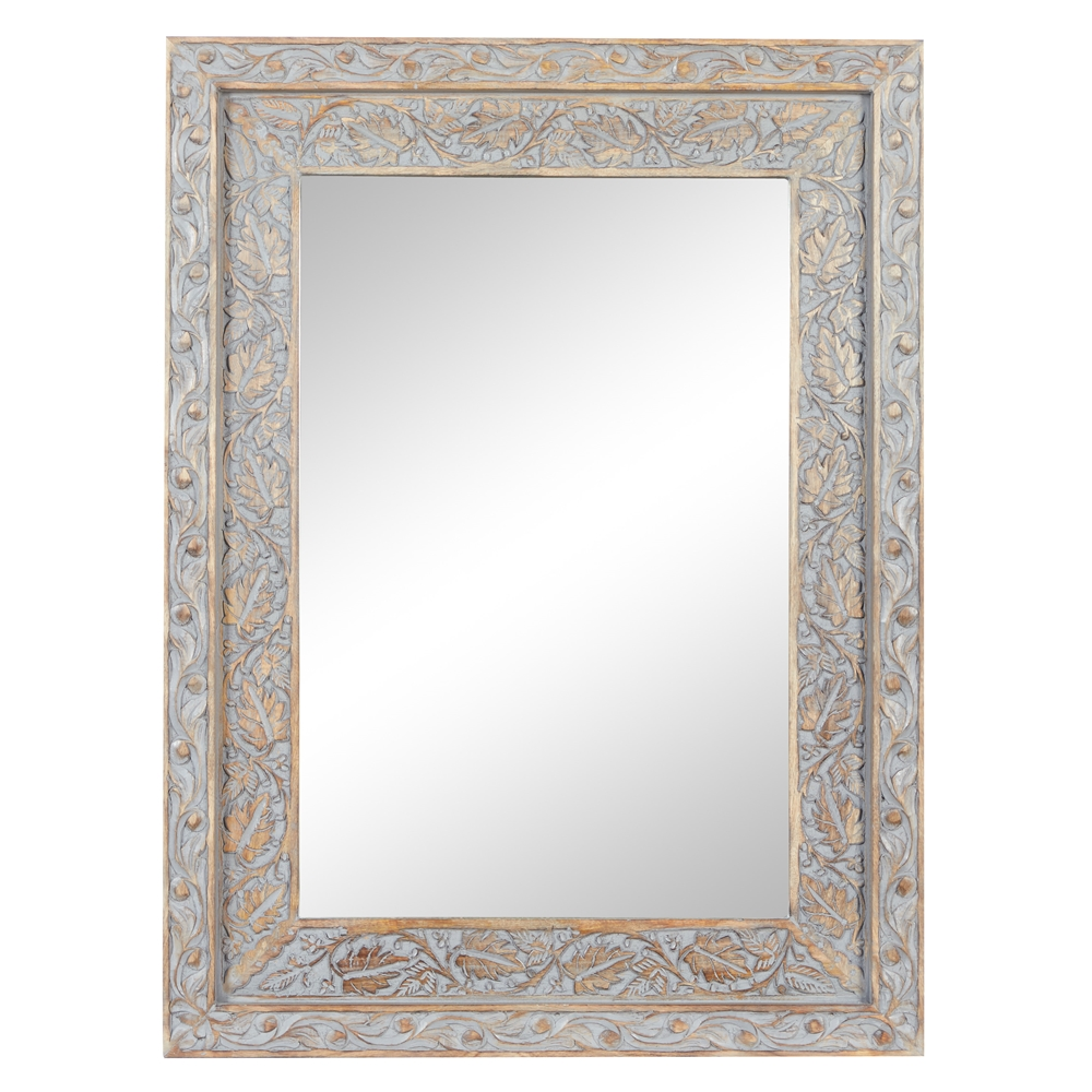 - This natural wood vanity mirror is housed inside a hand-carved frame