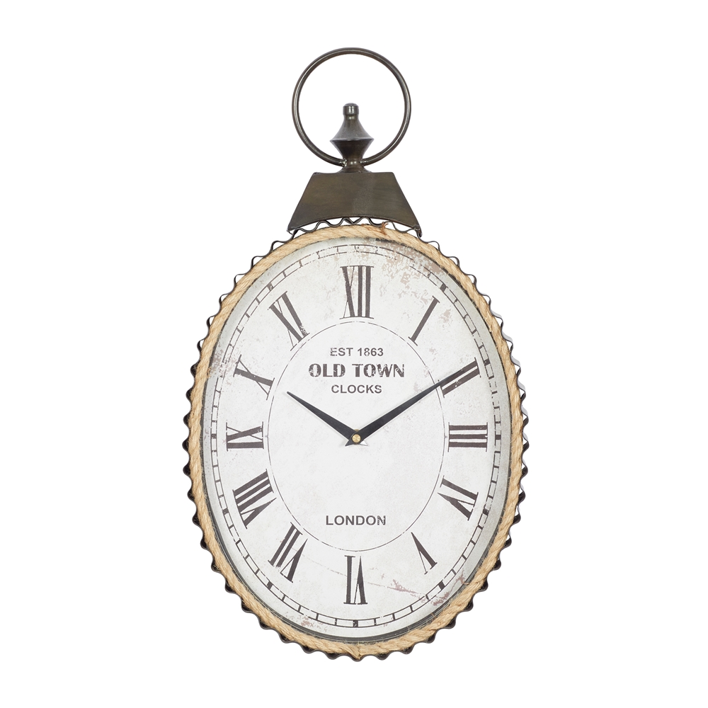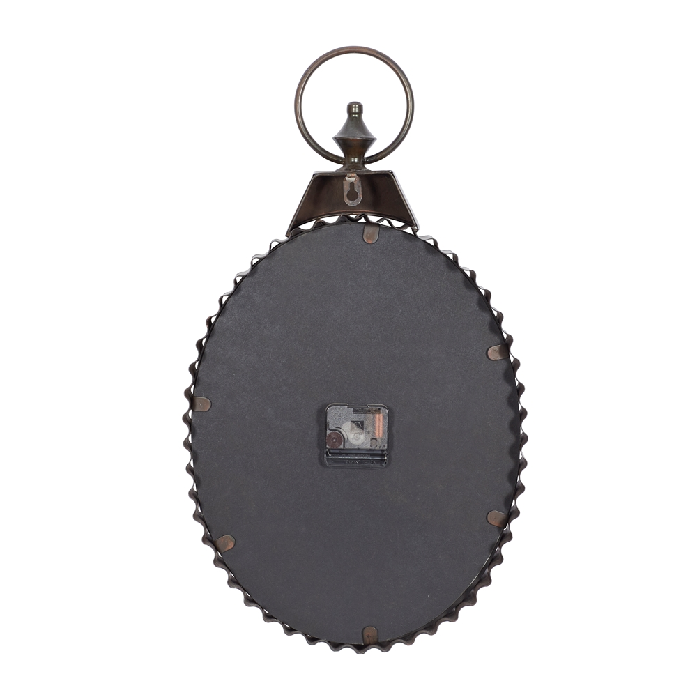 - This antique clock features an oval-shaped rusted clock design, a jute-roped inner body detail, and a loop ring hanger carving at the top
