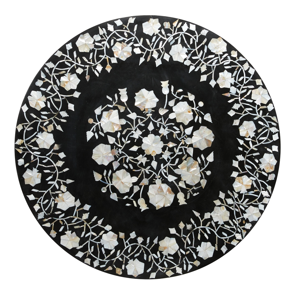 - Features shell inlays in round floral patterns on the smooth black wooden tabletop, and supported by 4 splayed tapered legs in a metallic gold finish