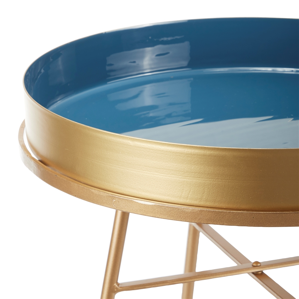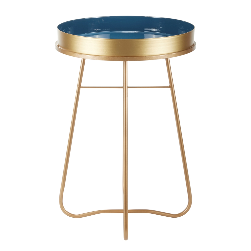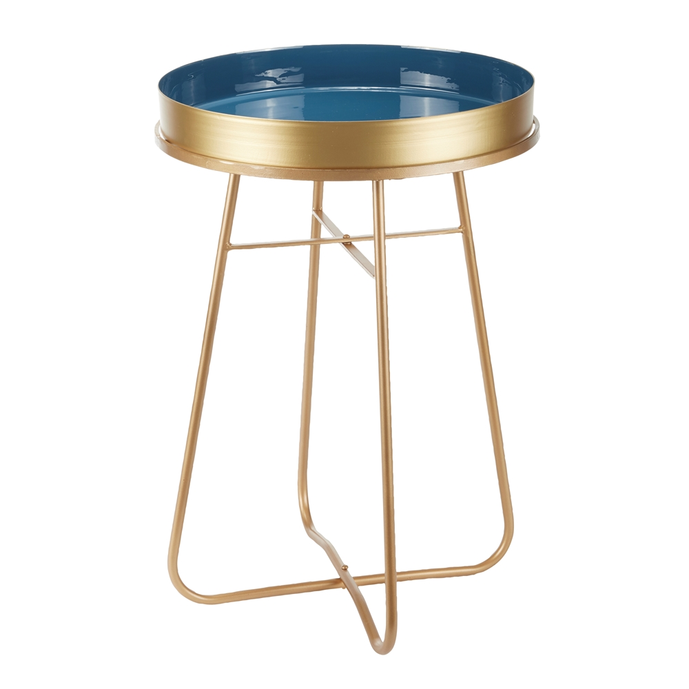 - This round metal accent table has a dazzling gold exterior and bright blue interior
