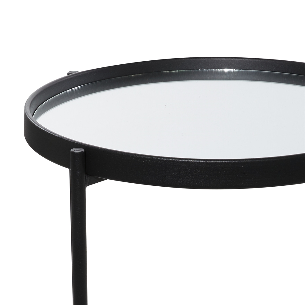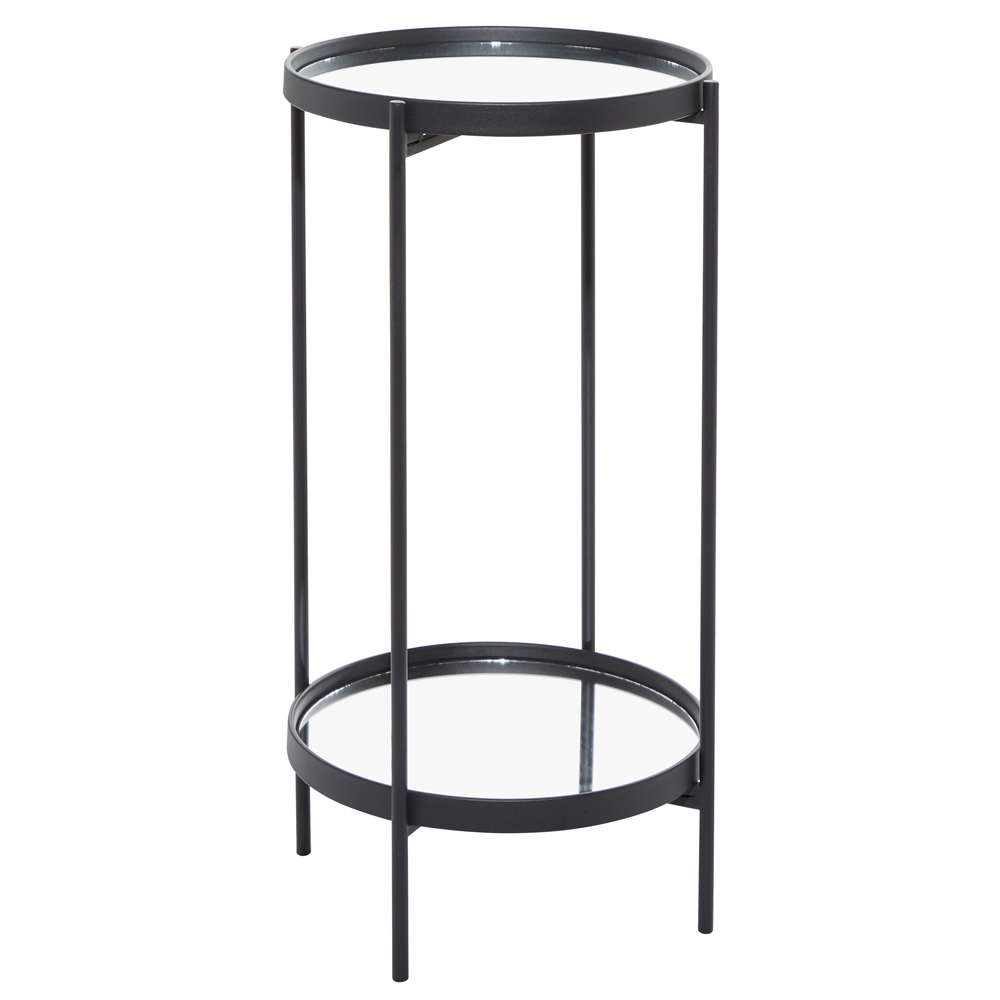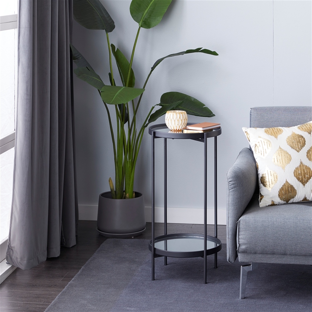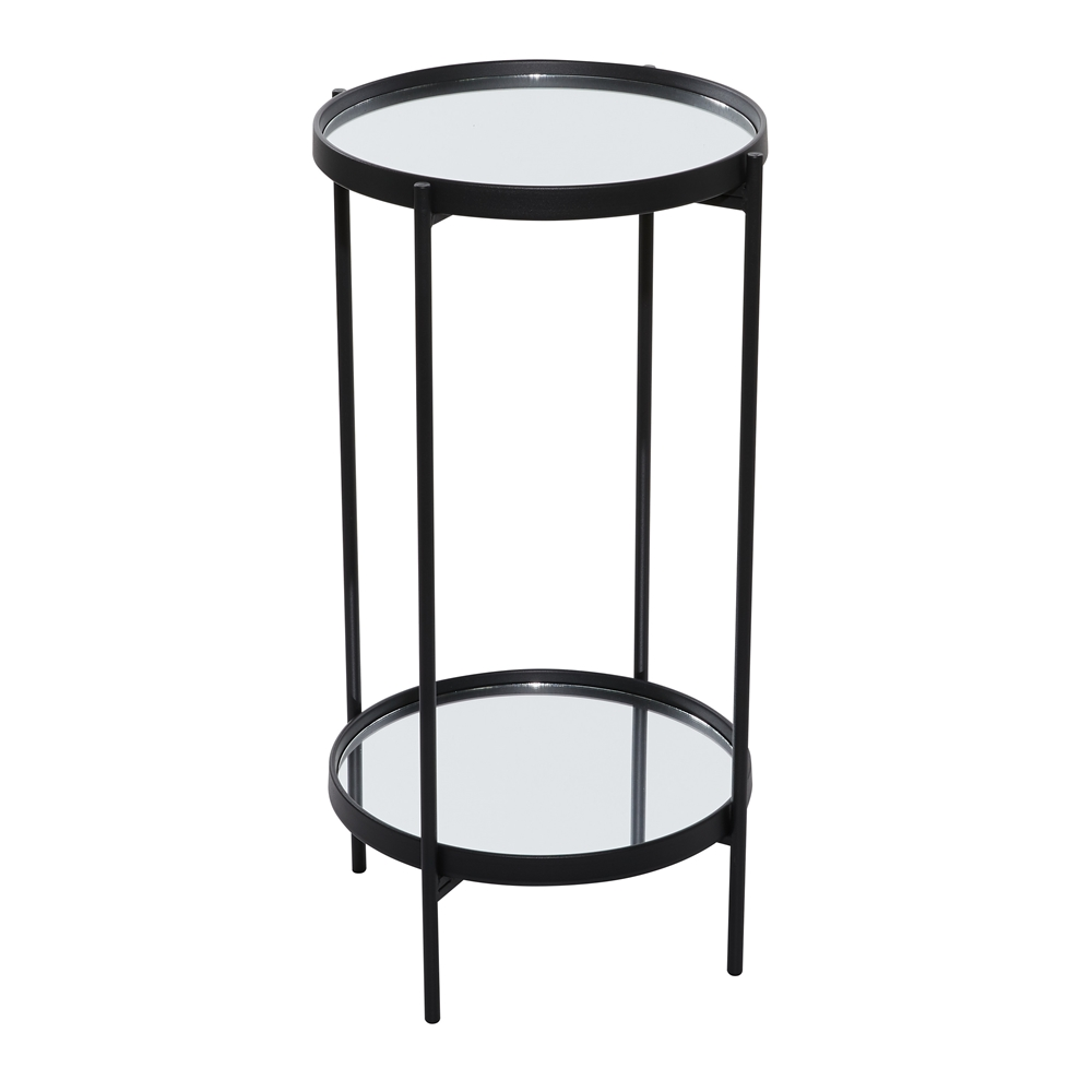 - This captivating round accent table features a reflective glass finish and a polished black iron finish