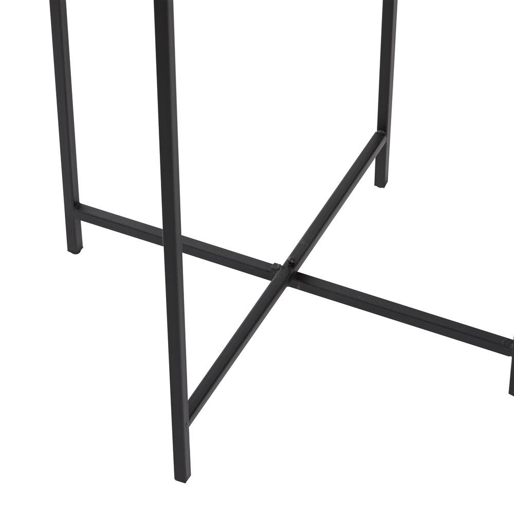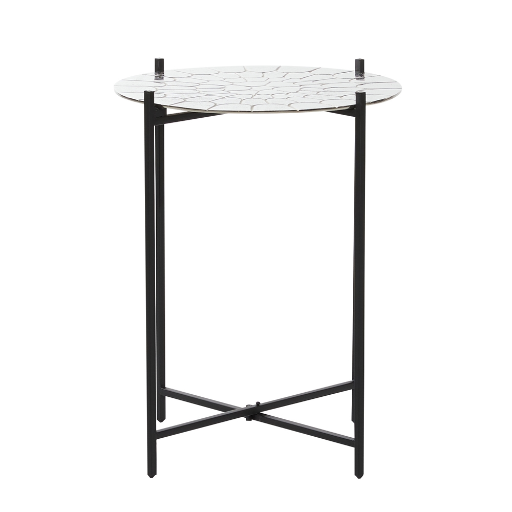 - This round metal accent table has a silver surface and black frame that fits a contemporary aesthetic