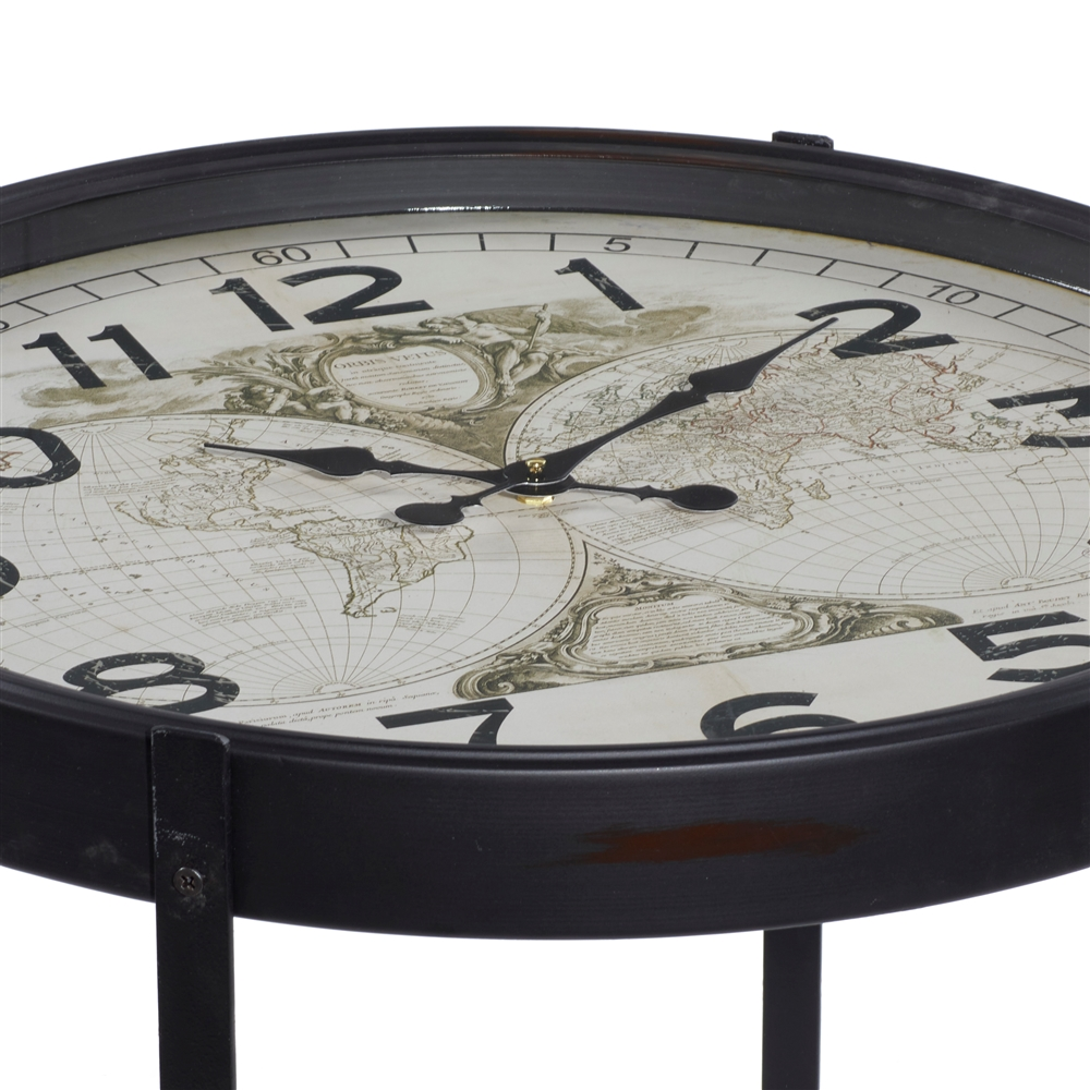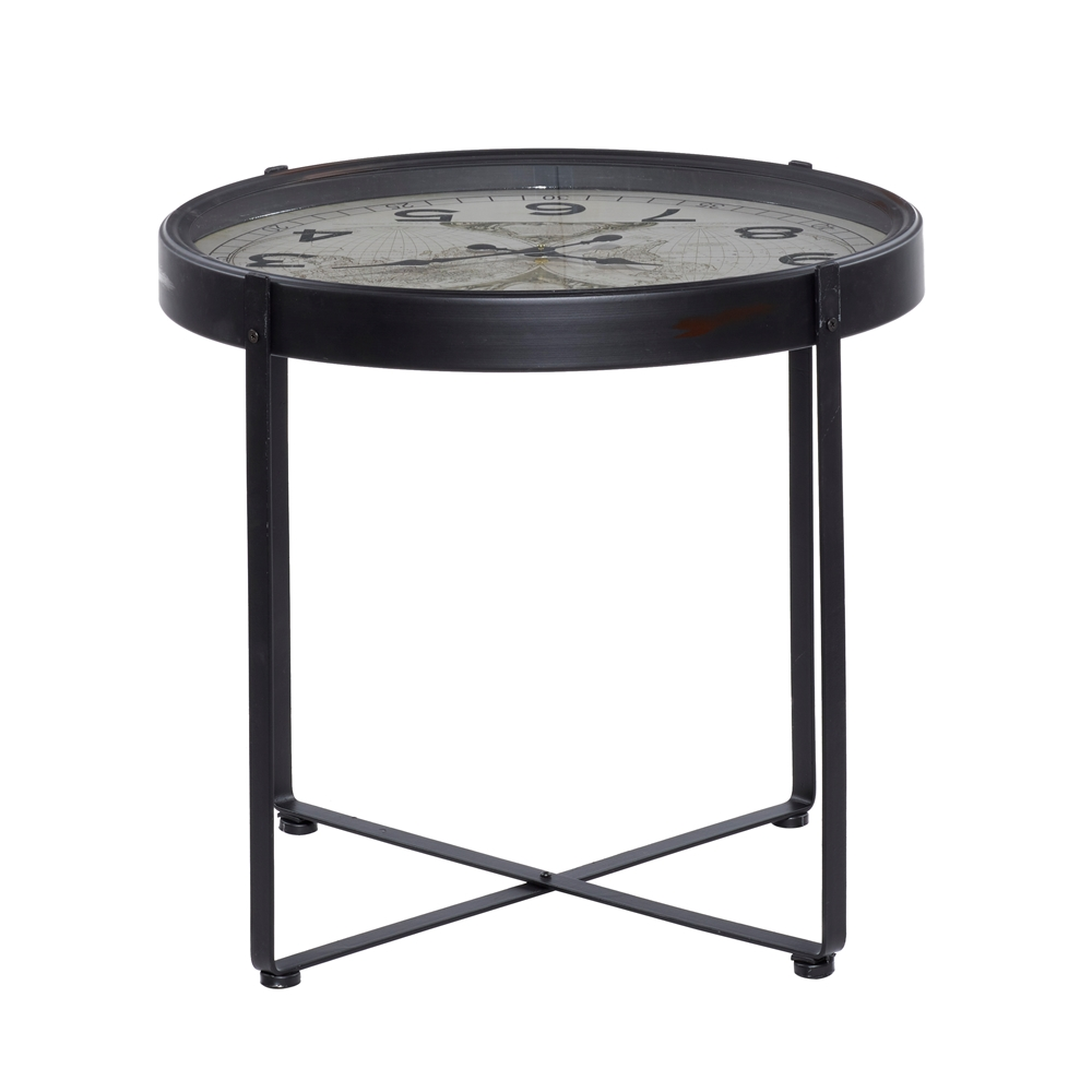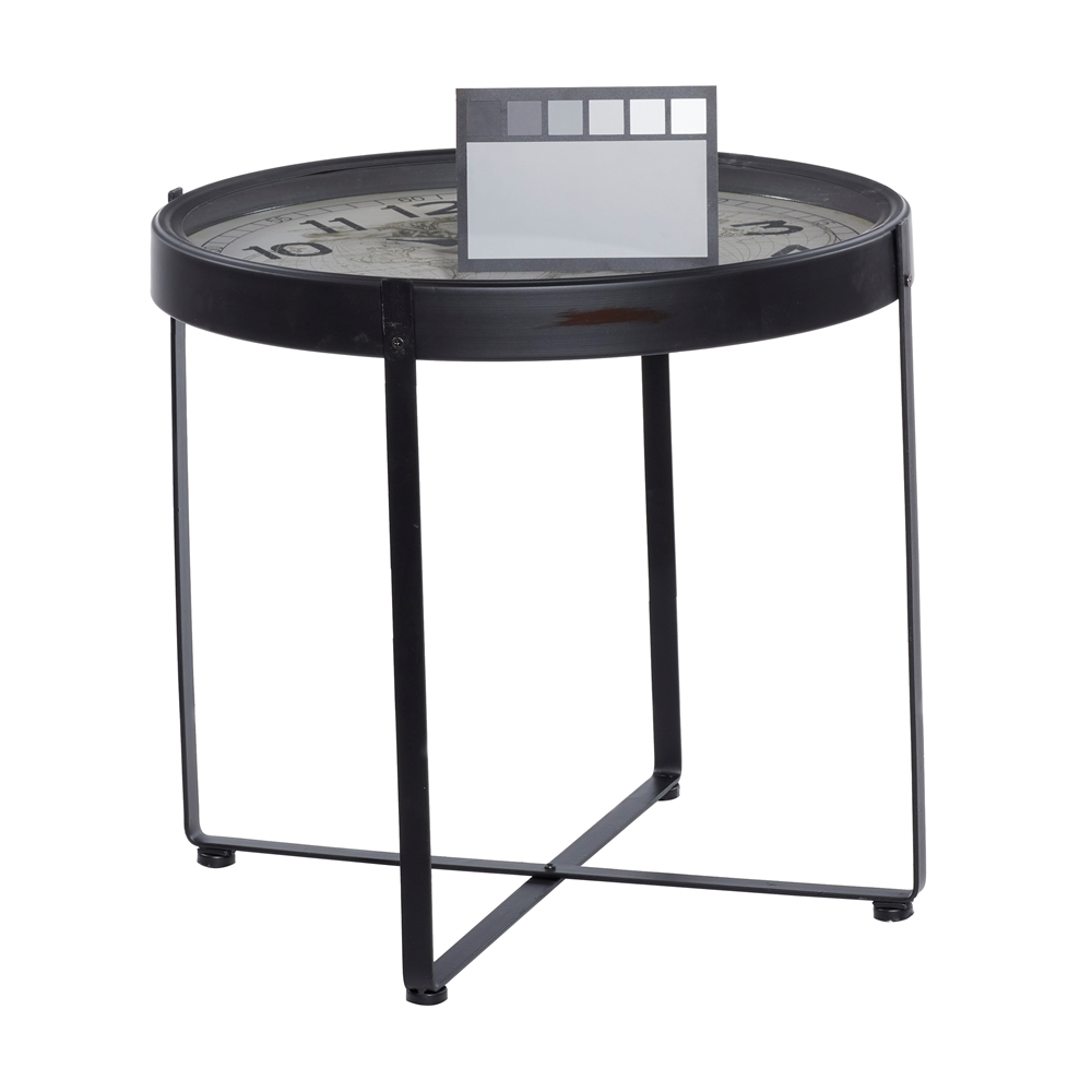 - This round clock-style side table highlights a metallic black finish that is best to pair with dark and neutral-coloured decors