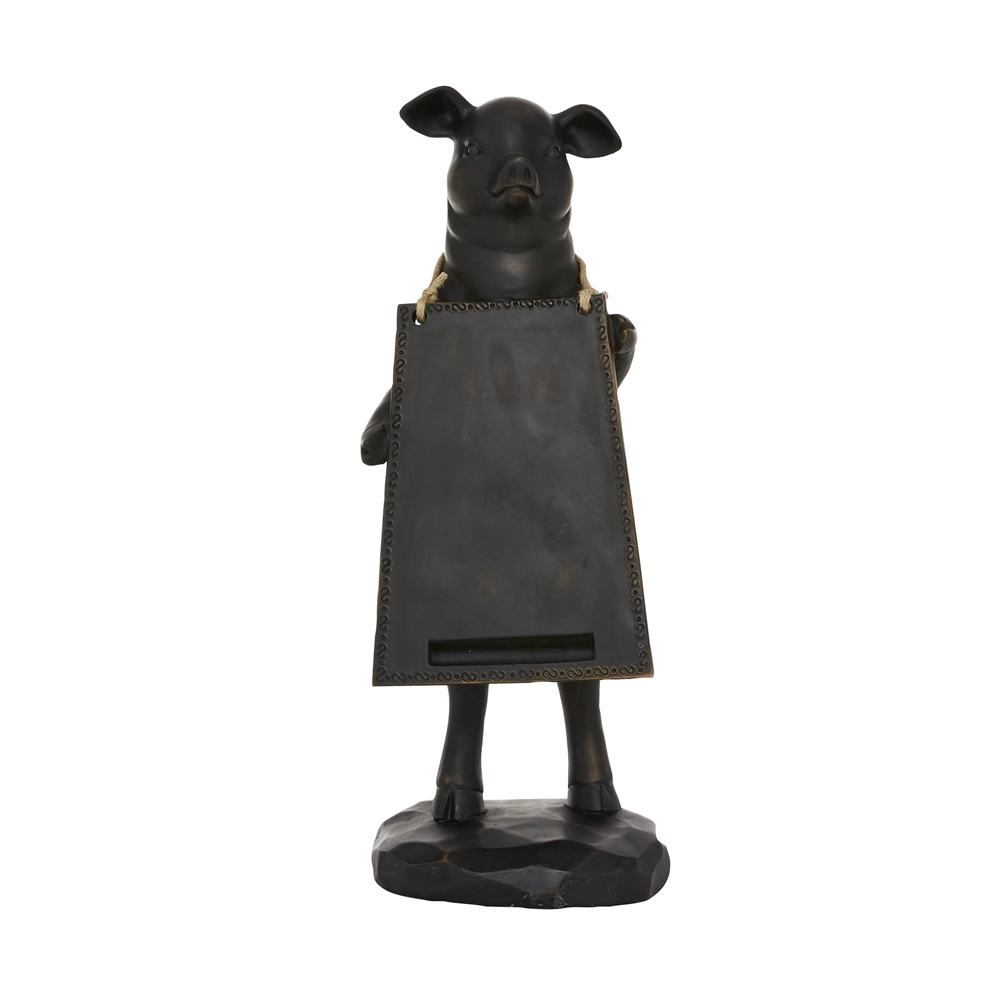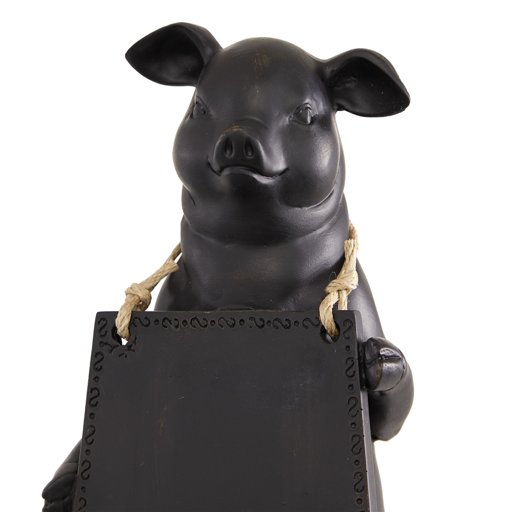 - Features a standing pig with a wooden chalkboard laced around its neck and attached to an oval base