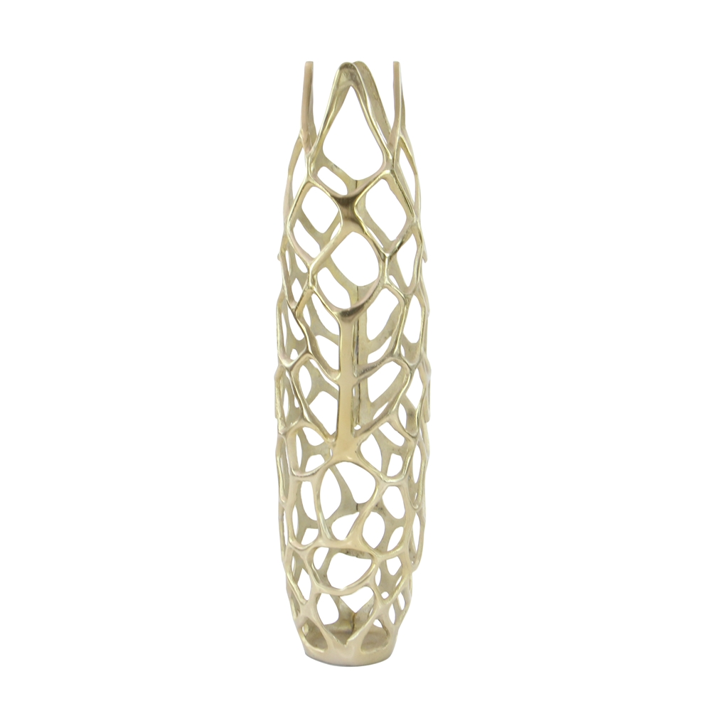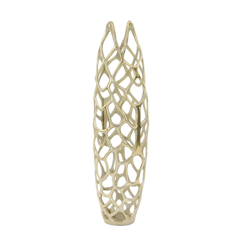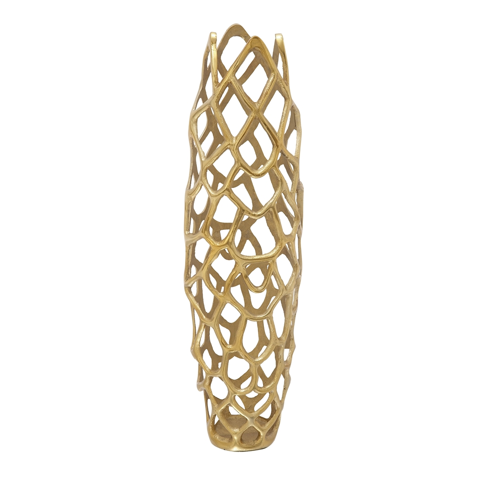 - A gold tapered vase highlighting a cut-out woven net-inspired design
