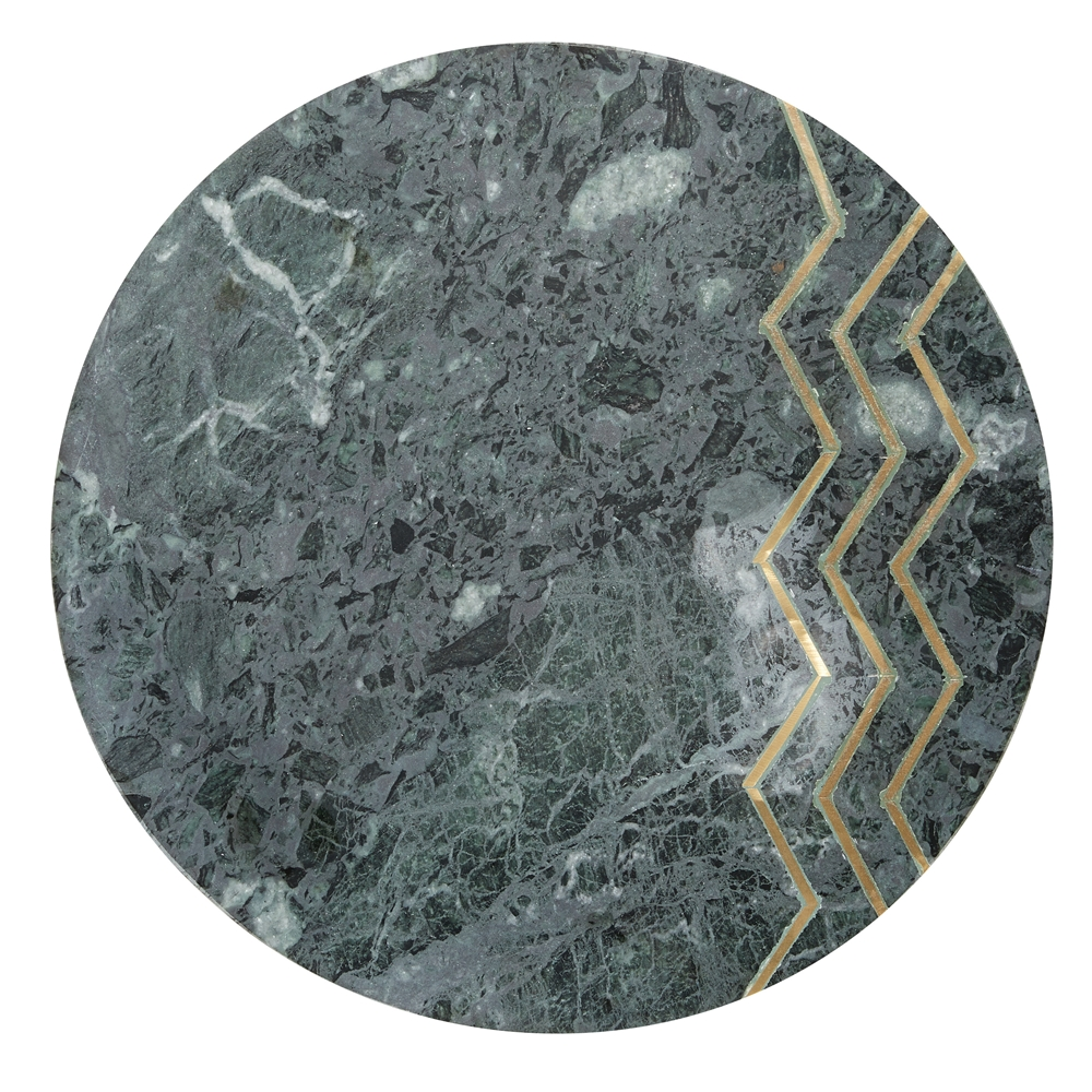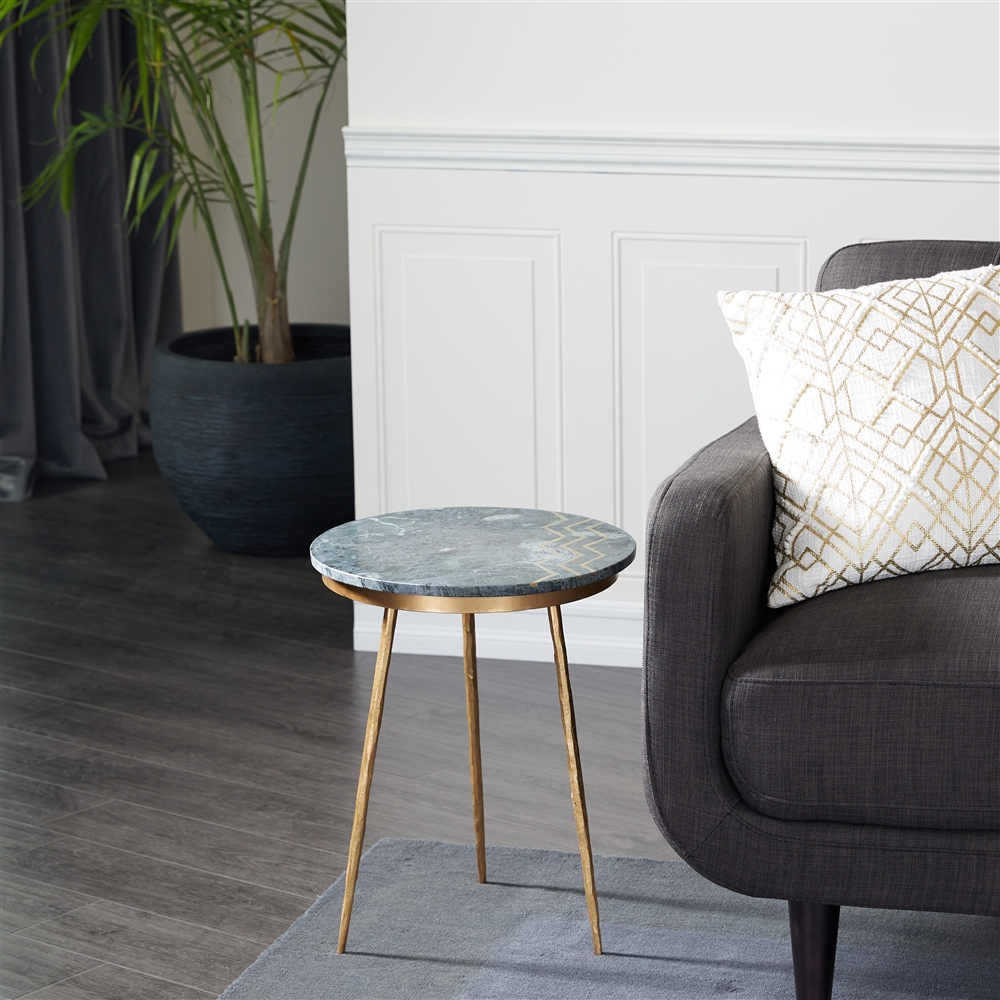 - This round metal accent table features a textured gold metal finish and marbling inspired black stoneware finish