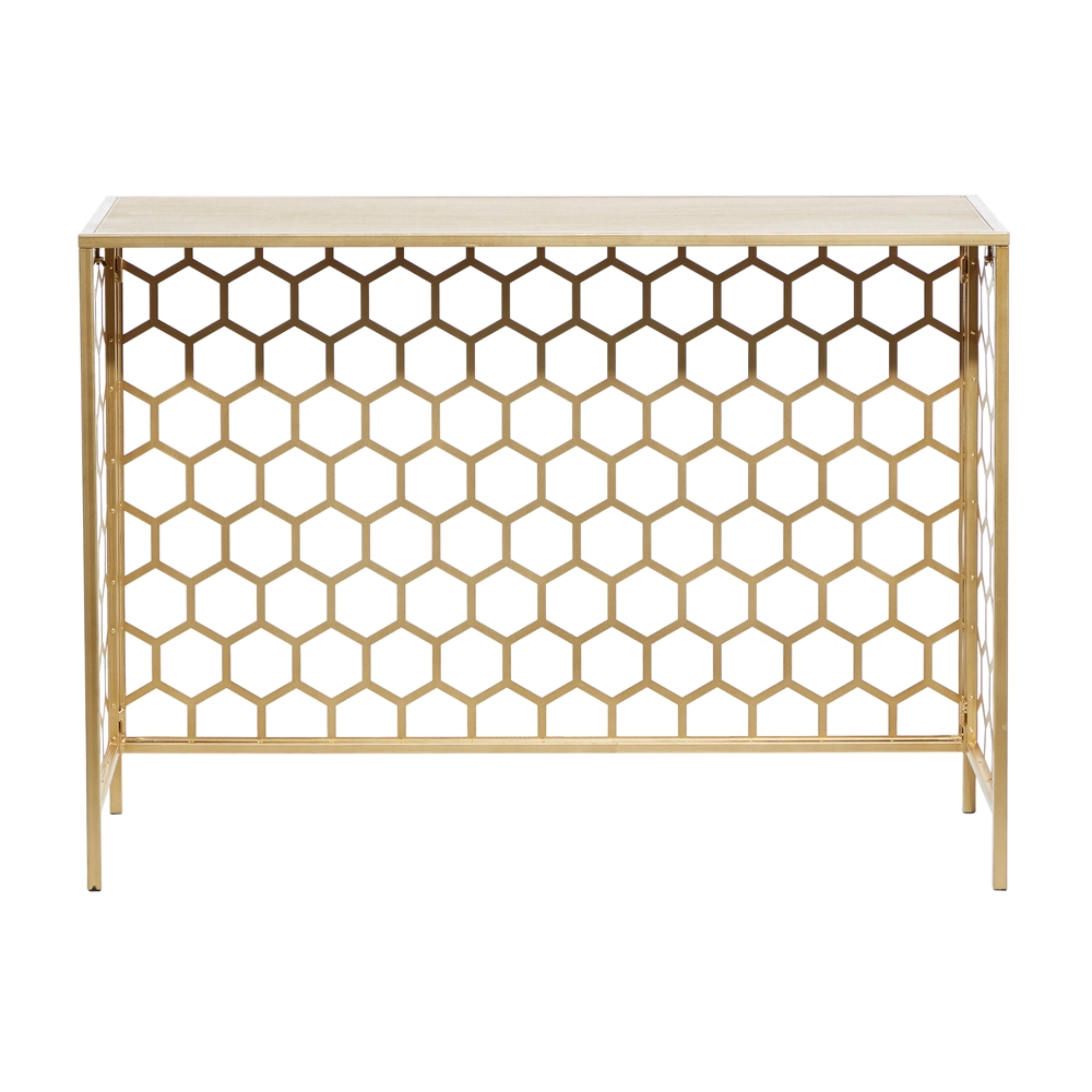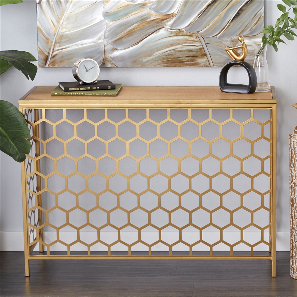 - This contemporary table features an open design beehive patterned body made of solid iron and a wooden tabletop