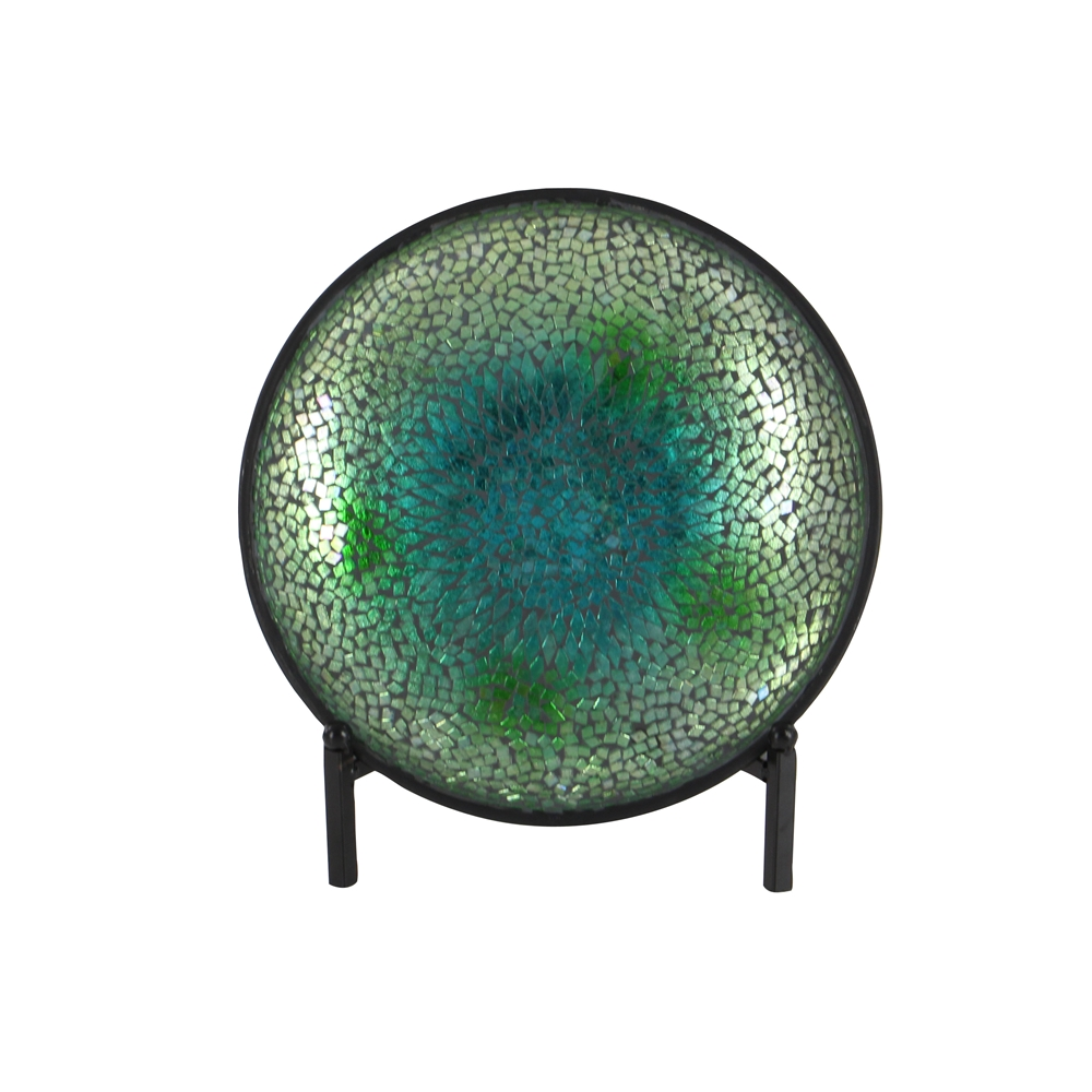 - This glam style inspired design multicoloured glass and metal mosaic platter with easel features a round profile with an elegant flower pattern formed in the midst of the mosaic pieces
