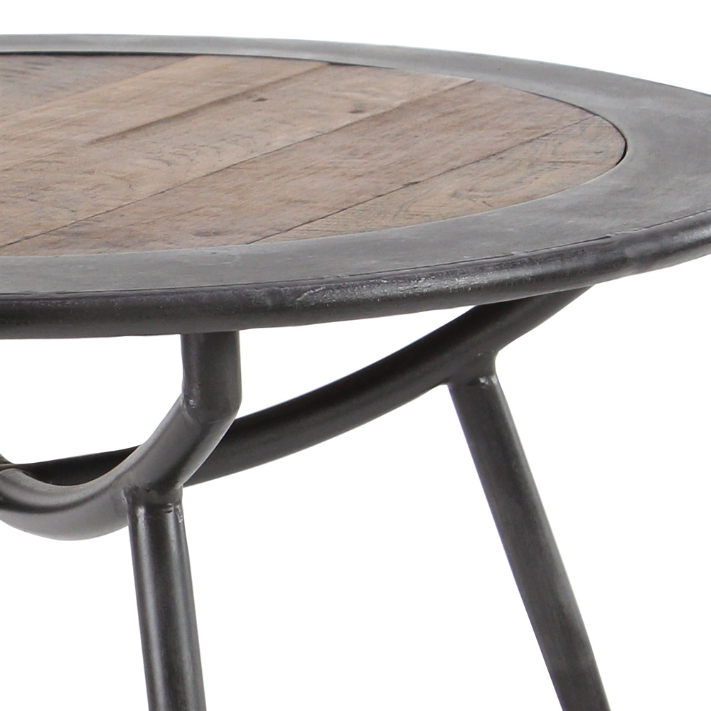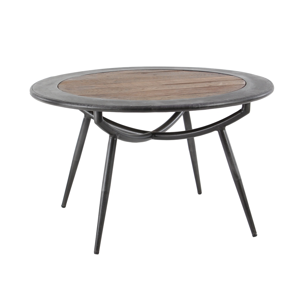 - Its unfinished look, dark colour scheme, and wood and metal construction make this round iron and wood coffee table suitable for rustic and industrial homes