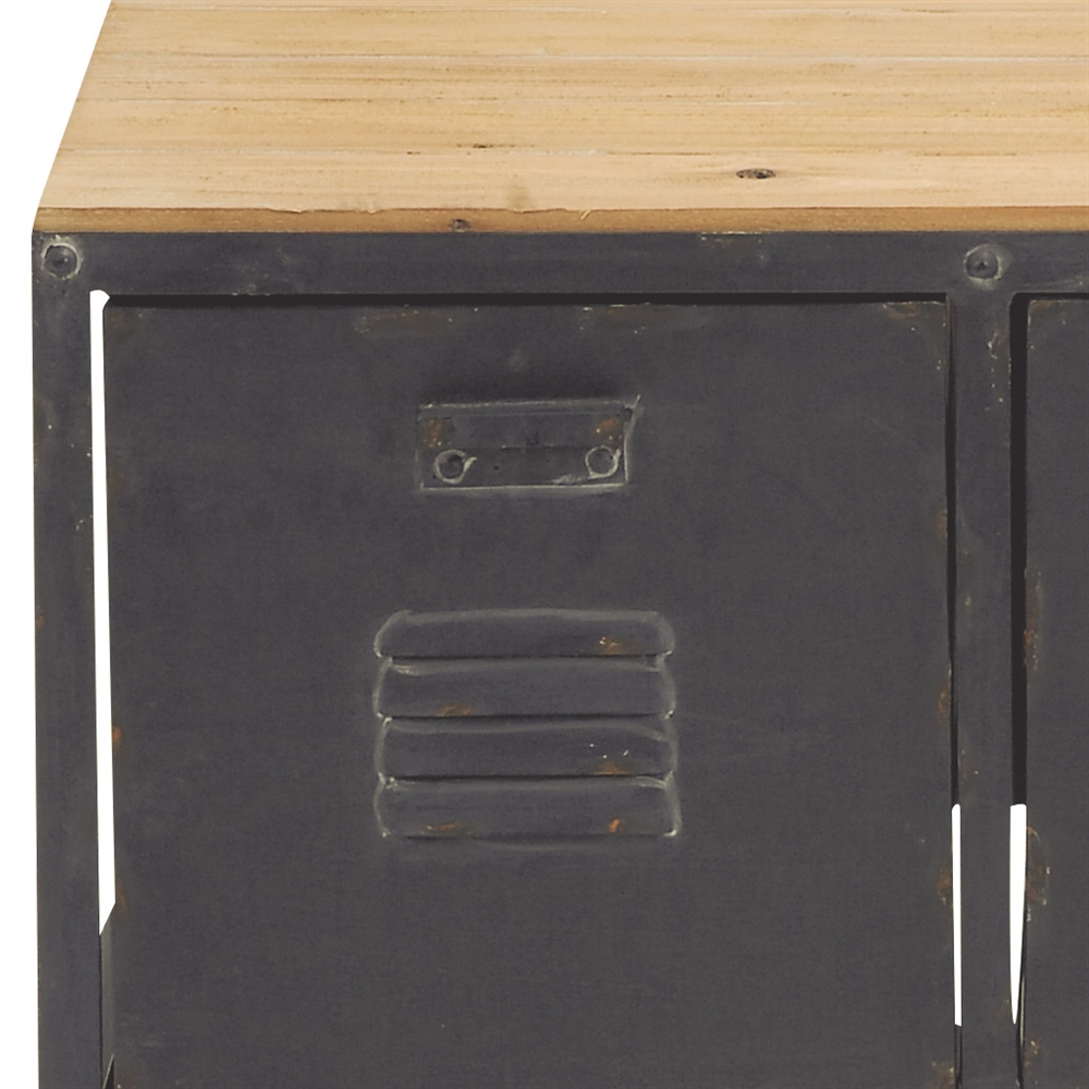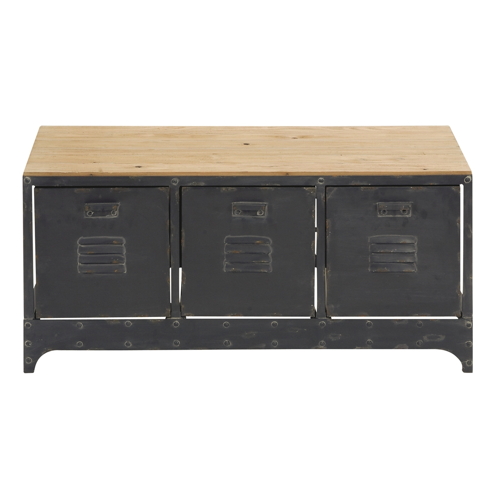 - This industrial TV cabinet has a rectangular frame that supports a wooden tabletop and houses 3 pull-out drawers