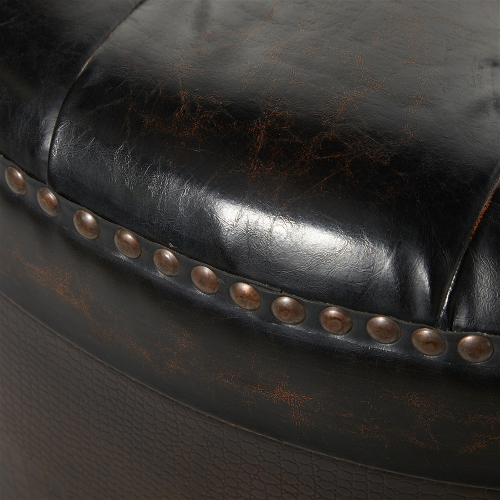 - Tufted faux leather storage ottoman with warm faux snakeskin strip around body and block feet with dark wood finish with brass stud trim