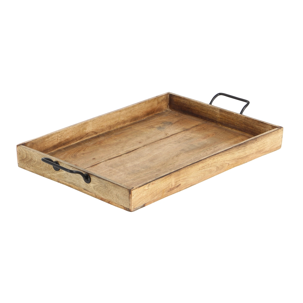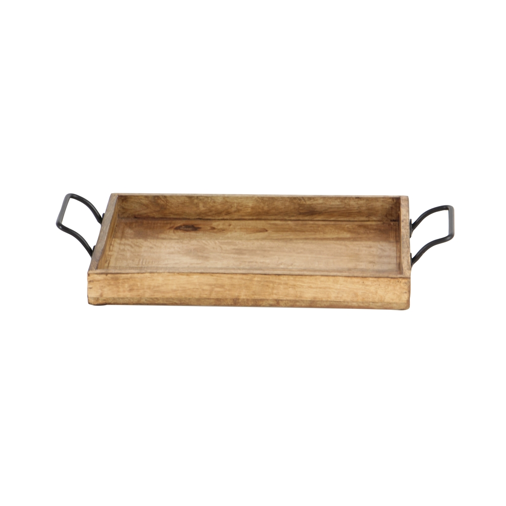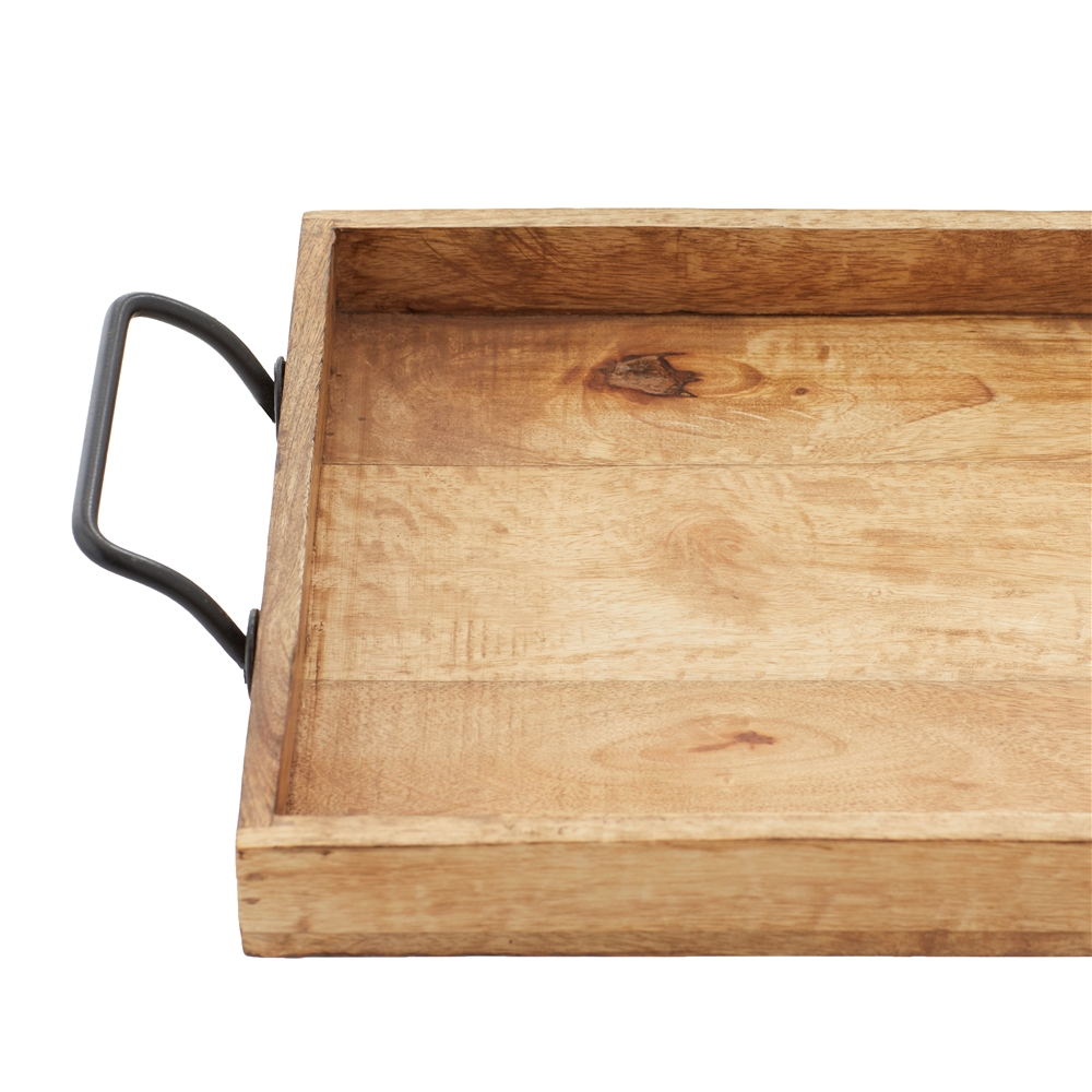 - Rectangular wooden trays with metal-forged handles