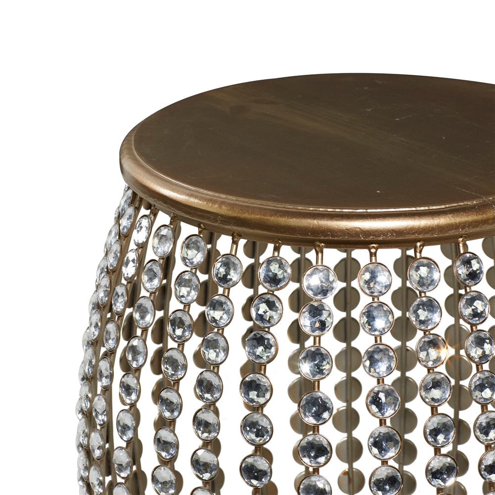 - This round beaded accent table is crafted of robust iron and wood as well as shiny beads