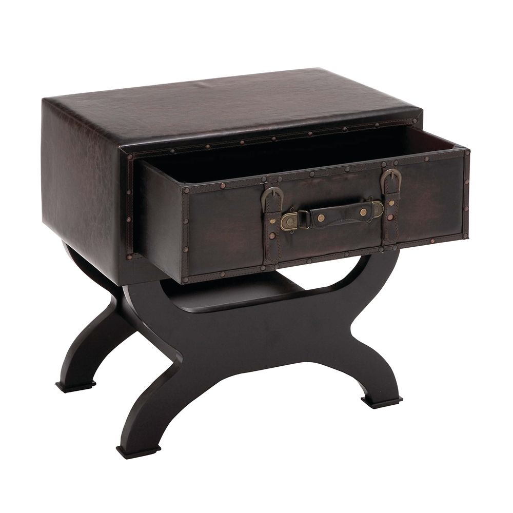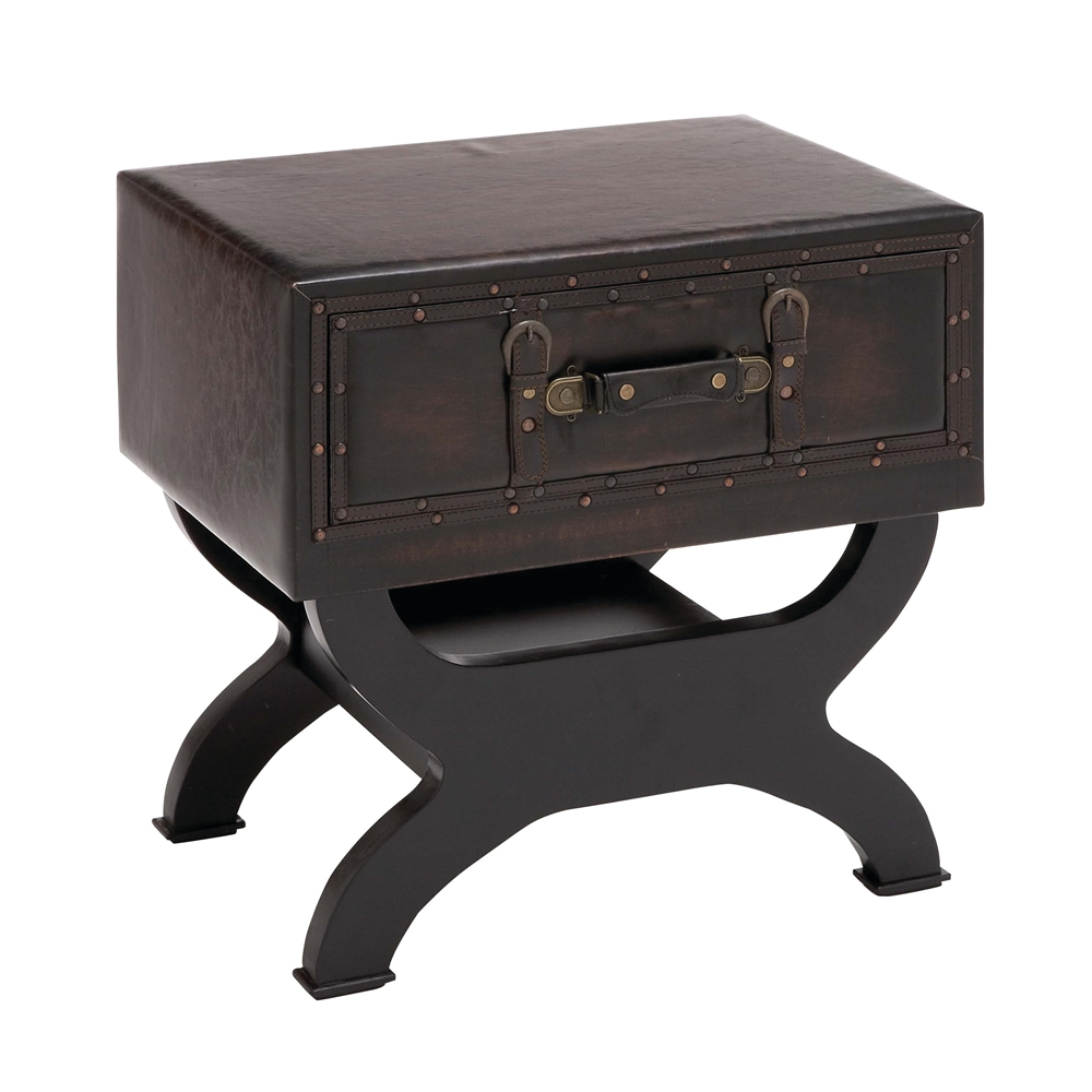 - This trunk end table highlights a glossy dark syrup brown leather finish with rivetted lining