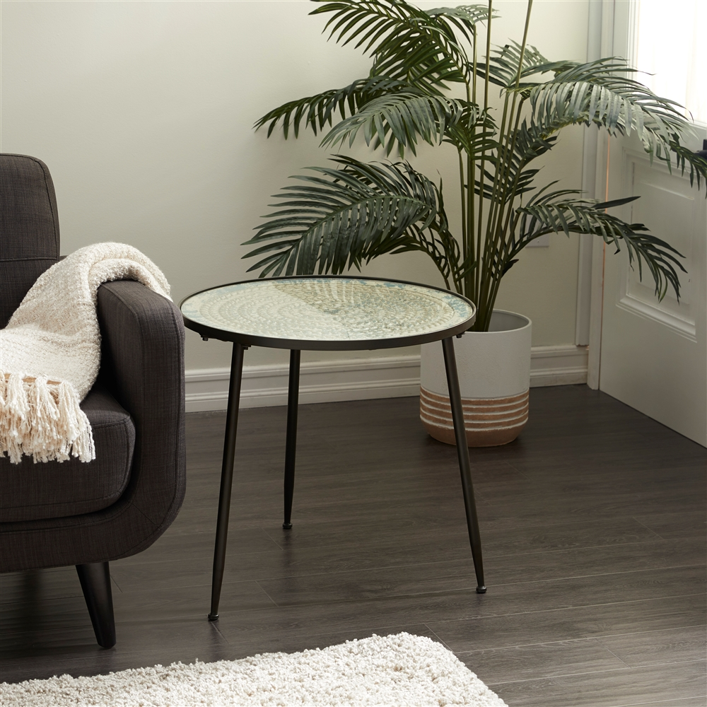 - This round side table showcases a sturdy and decorative combination of iron, MDF, and tempered glass