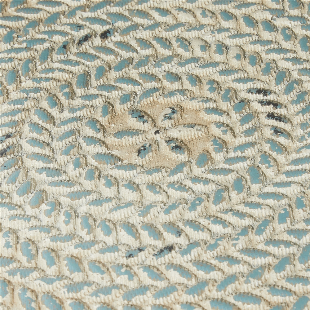 - Features natural light wood hue and a distressed dusty blue finish