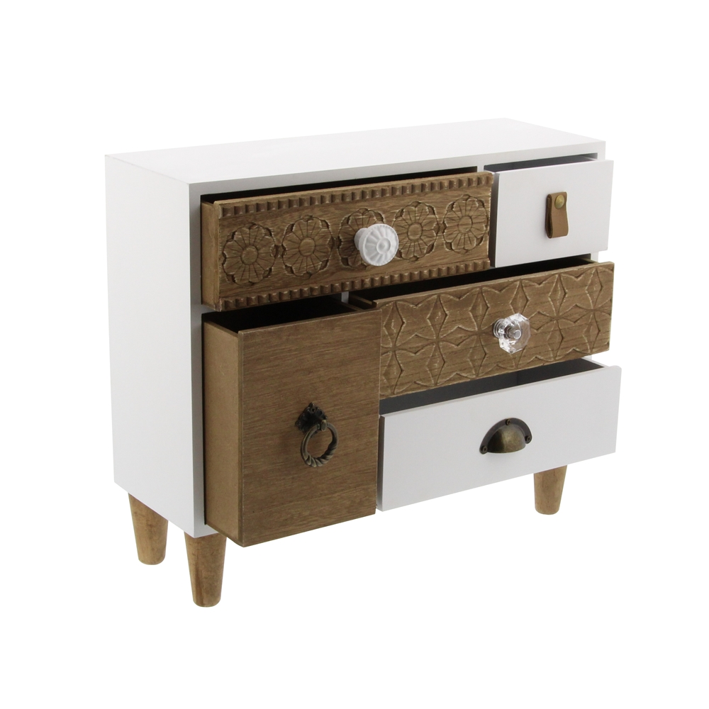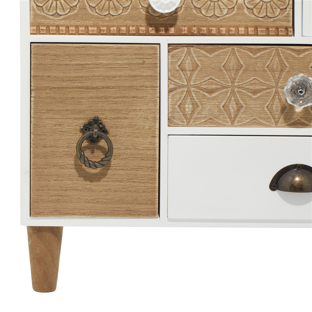- Two of the drawers feature carved floral and quatrefoil patterns for a boho touch