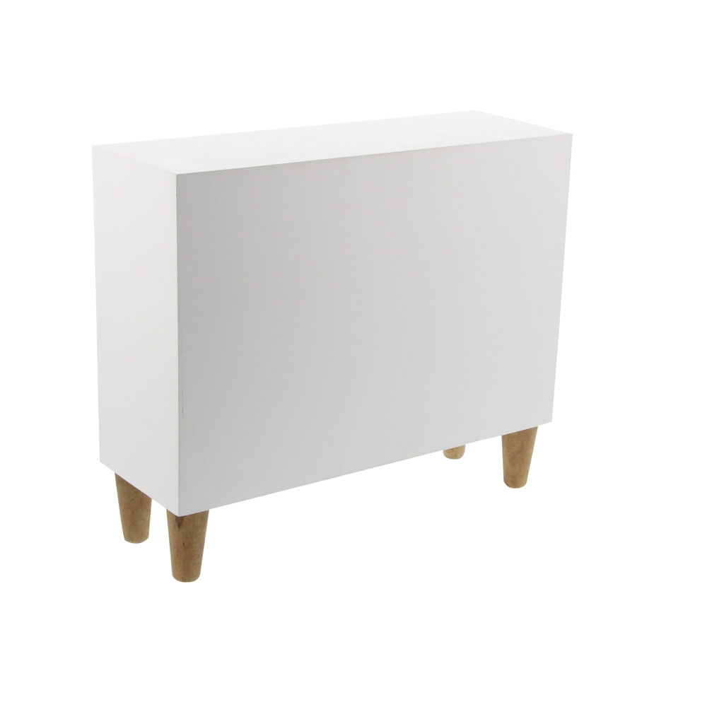 - MDF wood with both mocha brown wood grain and solid white finishes, brass, acrylic, and leather handles