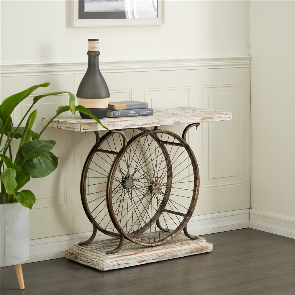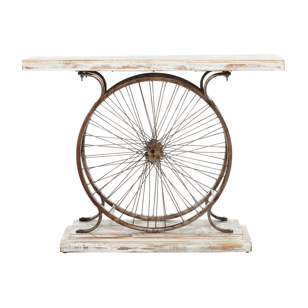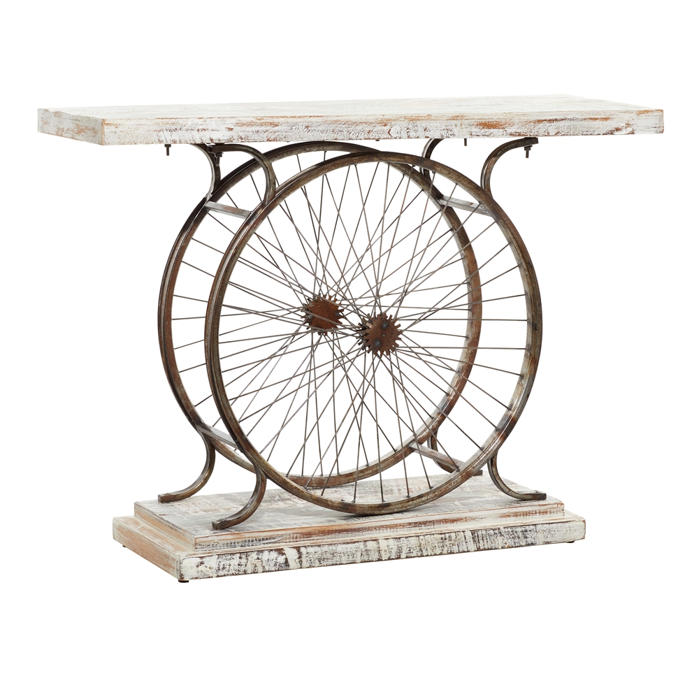 - It features 2 large iron bicycle rims holding together the base and the surface of this console table