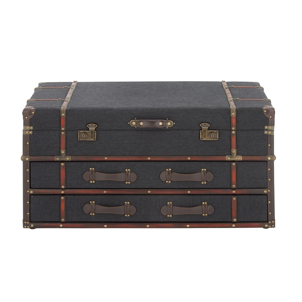 - MDF base with fabric upholstery, faux leather trim, wood trim, brass and metal hardware and handles